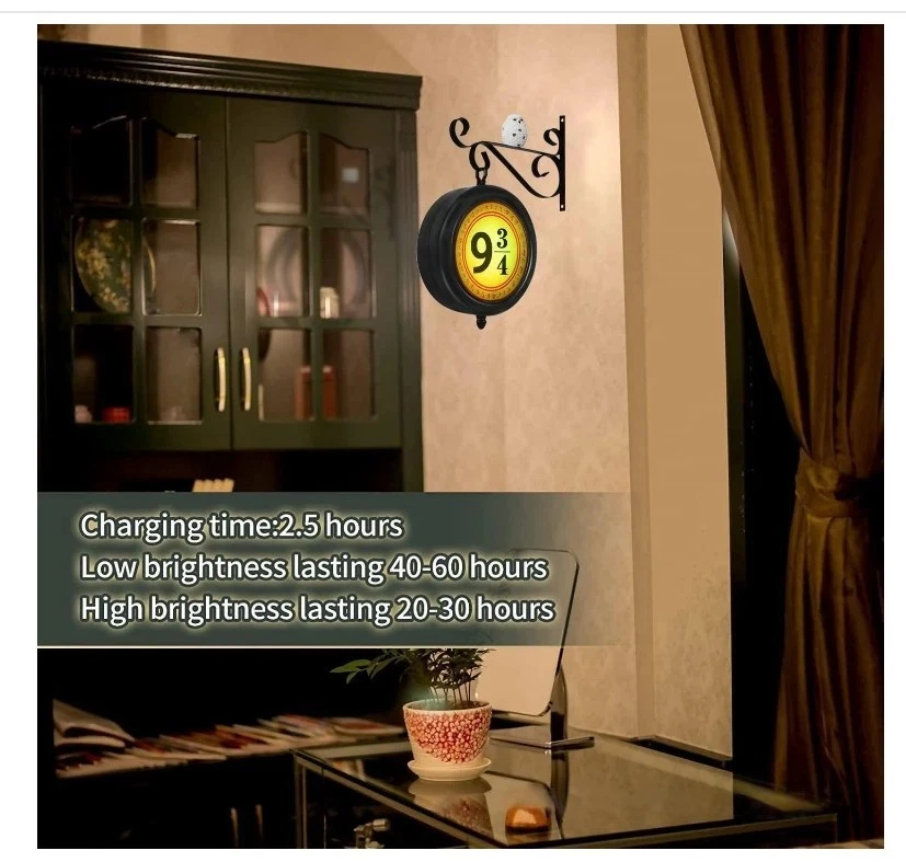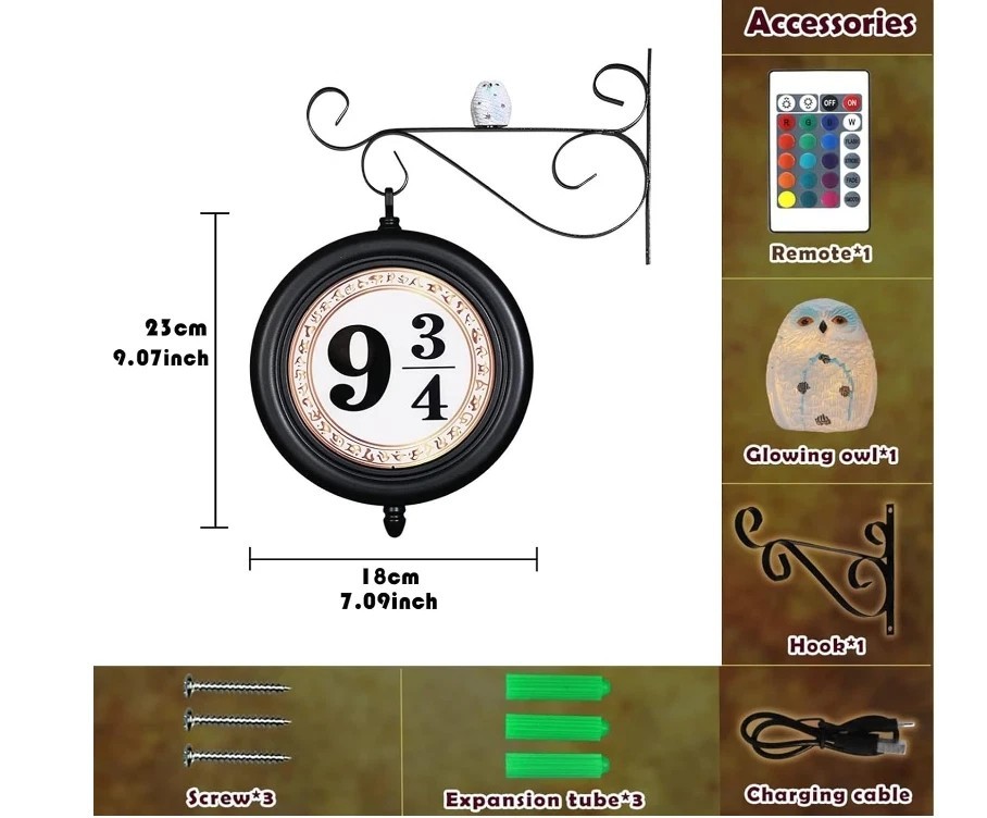 【Perfect Gift for Fans】this wall night light mimics the 9¾ wall sign, You can give it to your friends or kids as a gift for holiday, birthday, Christmas, New Year, Halloween, etc. 【Various Lighting Effects】The room decor lamp has RGB 16 Colors and 4 Dynamic Lights-Flash, Strobe, Fade, and Smooth to create different atmospheres, You can use the remote control to adjust. In addition, It also provides a lighting effect memory function.Note: Please aim the remote control at the infrared receiver next to the charging port of the lamp and use it within a range of 2m. 【Upgraded Deco Wall Lights】Our decorative lights are made of 16 bright light beads,double-sided light, the lighting effect is more uniform and equipped with a magnetic owl lamp, this decorative lamp is larger in size, has clearer pattern printing suitable for fans of all magic schools. 【Save Electricity Design】Built-in 2500 mAh battery, Type-C charging, charging time only takes 4 hours, and you can use it wirelessly for 12-30 hours. Wireless Remote Control, More Convenient to use. Note: The protective film on the panel needs to be removed to get the brighter lighting effect. 【Easy installation】You will receive 1 Platform 9¾ Night Light, 1 bracket, 3 screws, 1 lighted owl decoration, 1 remote control, 1 USB Type-C cable and 1 manual.When installing, just use the provided expansion screw to install the bracket, then hang the night lamp.
