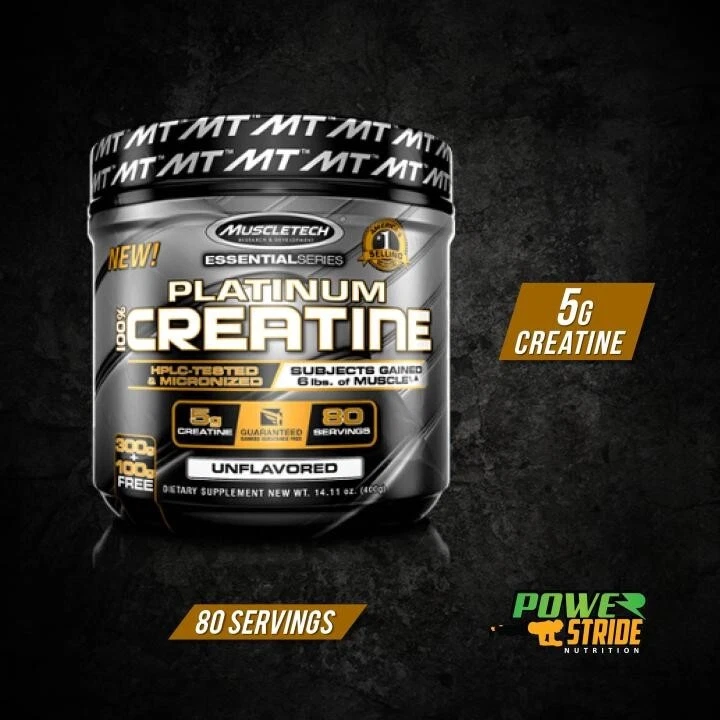 Product Description Amplify Strength, Power & Performance: MuscleTech Platinum 100% Creatine provides your muscles with a high-quality form of micronized creatine. Studies show that creatine increases muscle mass and maximizes performance. Unflavored. 80 scoops per tub. About this item Amplify Strength, Power & Performance: MuscleTech Platinum 100% Creatine provides your muscles with a high-quality form of micronized creatine. Studies show that creatine increases muscle mass and maximizes performance. Unflavored. 80 scoops per tub. More Power & Lean Muscle: Creatine enhances muscle cell regeneration of ATP, the body’s main source of energy. Higher ATP levels enable you to train harder and recover faster, resulting in increased productivity. Quality Micronized Creatine: In a clinical study, subjects using the recommended dose of creatine gained an amazing 6 lbs. of muscle in just six weeks. In a separate study, test subjects increased their bench press strength by 18.6% in just 10 days! Ultra-Pure & Versatile: Each serving contains a recommended 5g dose of ultra-pure creatine to help you exceed your fitness goals. Made with no fillers and sugar, the unflavored formula makes it easy to mix with your favorite supplements or beverages. Pushing the Limits of Science and Human Potential: MuscleTech’s commitment to research, development, and innovation is the reason we continue to be an elite name for redefining performance through cutting-edge products and high-quality ingredients.