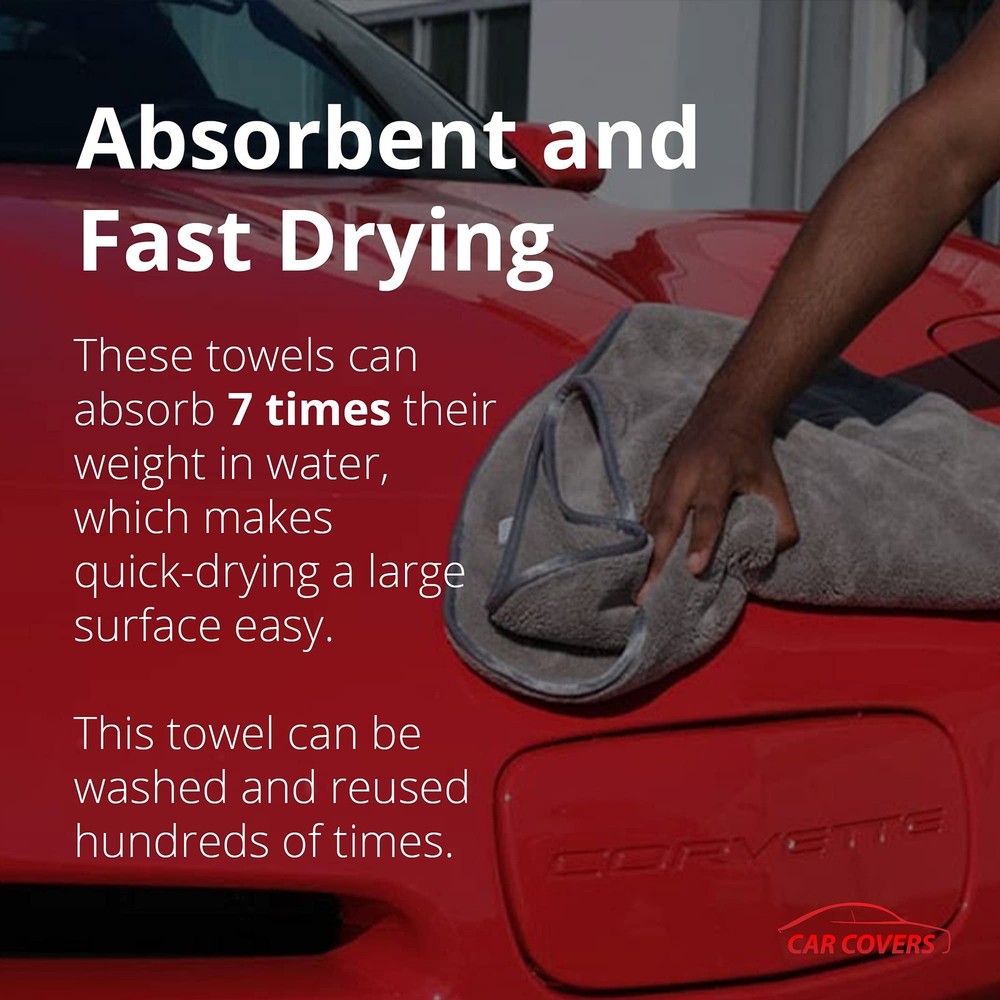 Dries your entire vehicle in just 90 seconds! Experience the ultimate drying power with our 2-pack of premium microfiber towels designed for all vehicles. After a satisfying car wash, achieving a streak-free and spotless finish is a breeze with these car drying towels. Engineered from the highest quality polyamide and polyester with soft silk hems,, they swiftly absorb water without scratching your car's surface, giving you the perfect shine you strive for. Measuring 25 1/2 inches x 36 inches, these car towels cover more surface area, making each drying session more efficient. Not limited to drying, these microfiber cloths are versatile companions for all your car cleaning tasks. Wipe down interiors, polish exteriors, and tackle any detailing challenge with ease. Invest in quality with our microfiber drying towels for cars. The dual-pack ensures you always have a spare at hand, ready to tackle any task. These car wash drying towels are designed for longevity, retaining their absorbency and softness even after numerous uses. Make them an indispensable part of your car wash supplies. Say goodbye to ordinary car towels. Elevate your car care routine with these ultra-absorbent, large microfiber towels. Order now and discover the joy of effortless car drying and cleaning. Your car deserves the best -- give it the care it needs with our premium car microfiber towel set. EFFICIENT CAR DRYING: Our extra-large microfiber towels for cars, trucks, motorcycles, vans, RVs and SUVs make post-wash drying a breeze. Achieve a spotless finish while preventing scratches and streaks on your vehicle's surface. VERSATILE CLEANING COMPANION: More than just car drying towels, these microfiber cloths are a versatile addition to your car care arsenal, car wash supplies or car detailing kit. Use them for polishing, cleaning interiors, drying before car wax and more. PREMIUM QUALITY AND ABSORPTION: Crafted from high-grade microfiber, these professional grade car wash towels offer exceptional water absorption to ensure quicker drying and spot-free finish. DUAL PACK FOR CONVENIENCE: With two car towels in this pack, you're prepared for thorough yet efficient car washes and detailing. These large microfiber towels for cars provide optimal coverage and efficient results. DURABLE CAR CARE ESSENTIAL: These microfiber drying towels are designed for long-lasting performance. Add them to your carwash supply and enjoy reliable, scratch-free drying every time.