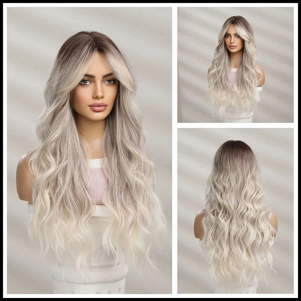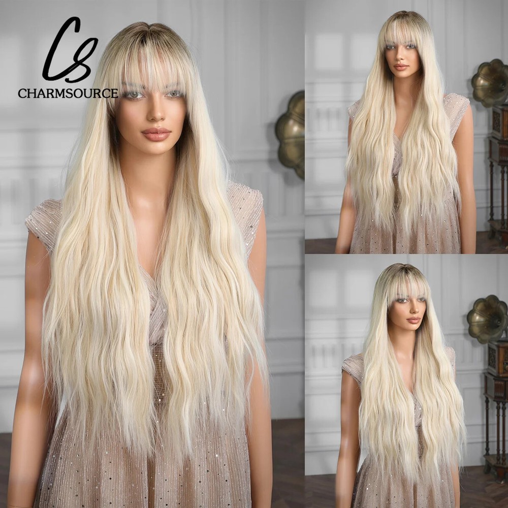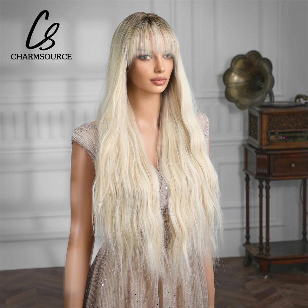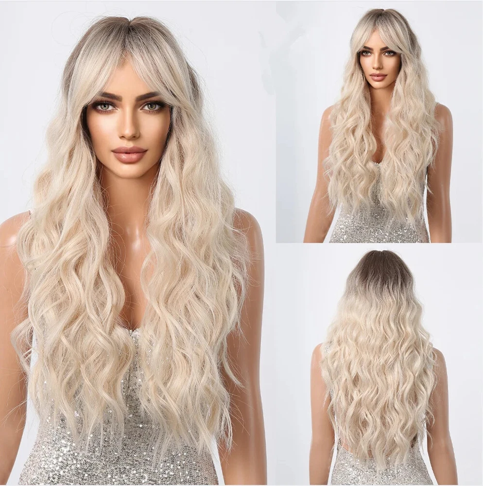 Platinum Ombre Blonde Wavy Synthetic Hair Wig with Bangs Dark Root Daily Party