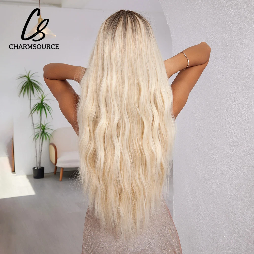 HomePlatinum Ombre Blonde Wavy Synthetic Hair Wig with Bangs Dark Root Daily Party