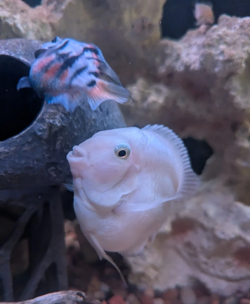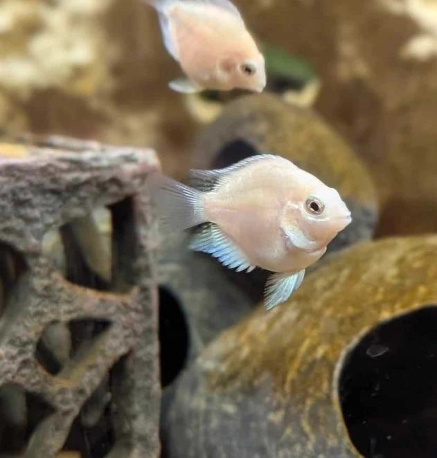 Introducing the Platinum Polar Parrot Cichlid , also known as the Snow White Cichlid a stunning addition to any freshwater aquarium. This CAN BE an aggressive species during mating season and is an intermediate level fish sold in a mixed gender lot from here in the United States. The Platinum Polar Parrot Cichlid finds tropical temperature waters to be the most relaxing and are known for their hardiness. The Cichlid is a fascinating creature that will bring a unique touch to your aquarium. In addition to its rarity, this fish is also known for its vibrant blue coloring and unique behavior patterns. It is perfect for fish and aquarium enthusiasts who enjoy a challenge. Don't miss out on the opportunity to add this amazing species to your collection.