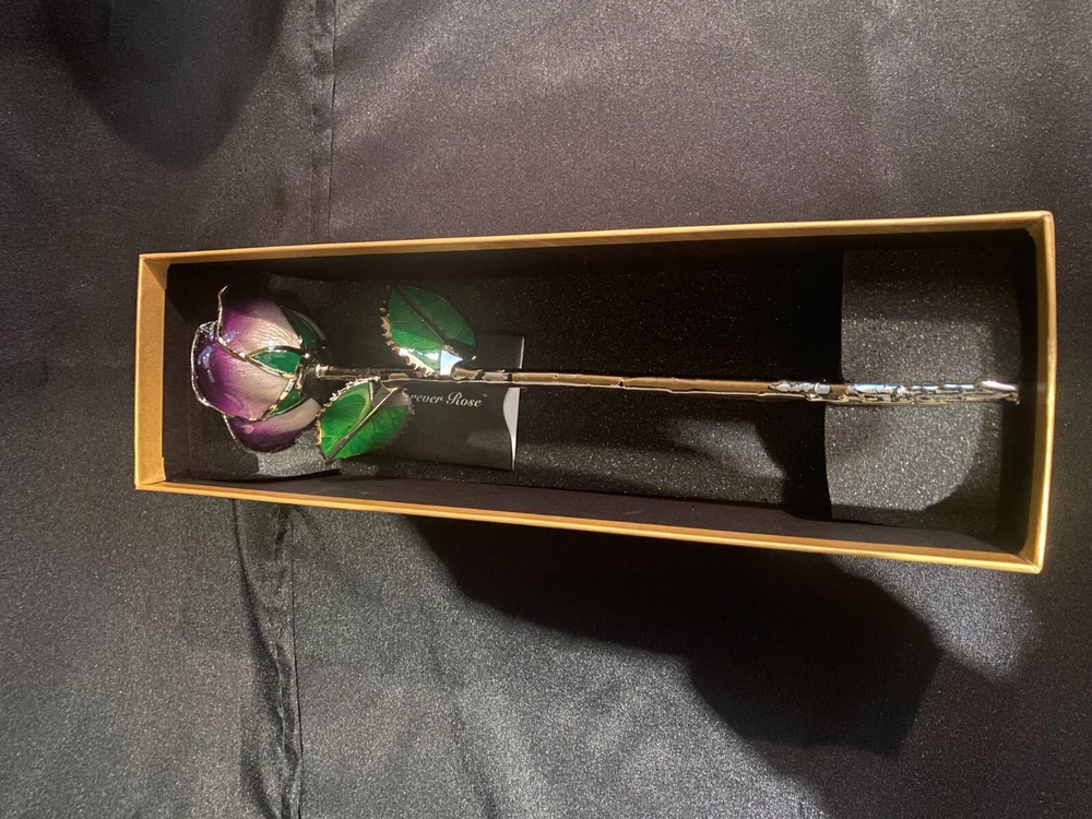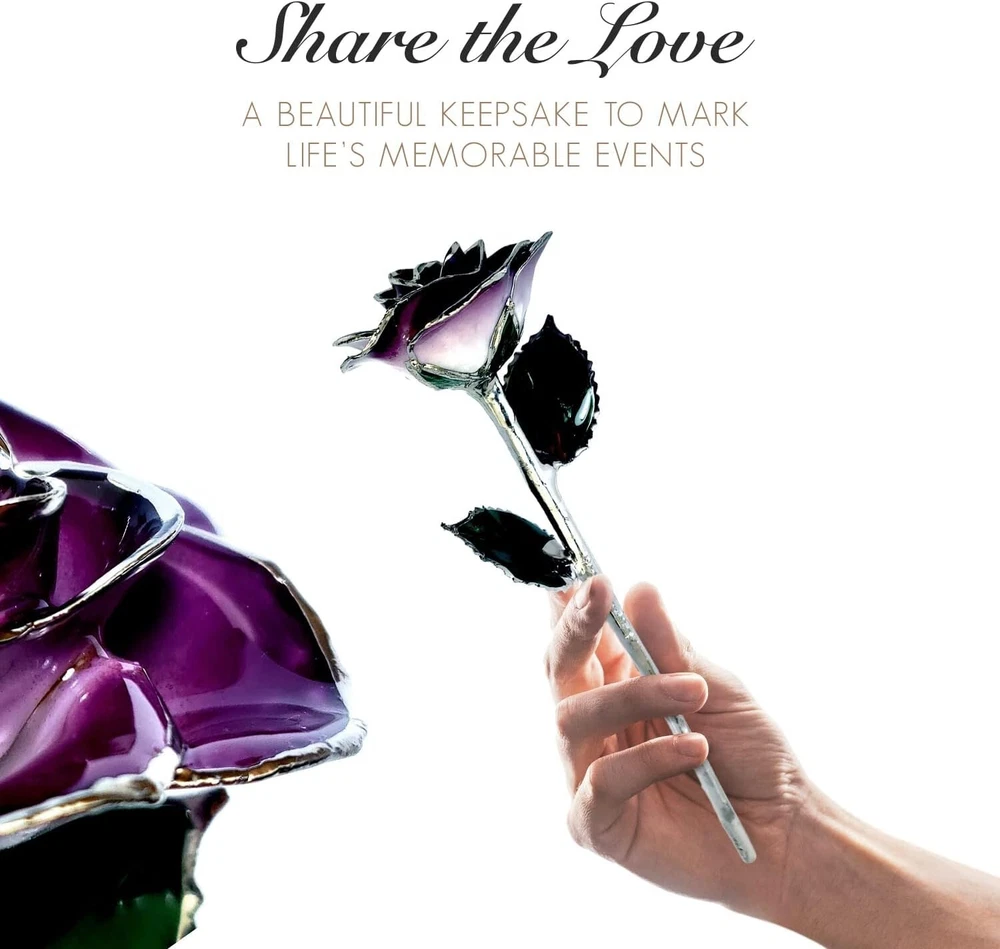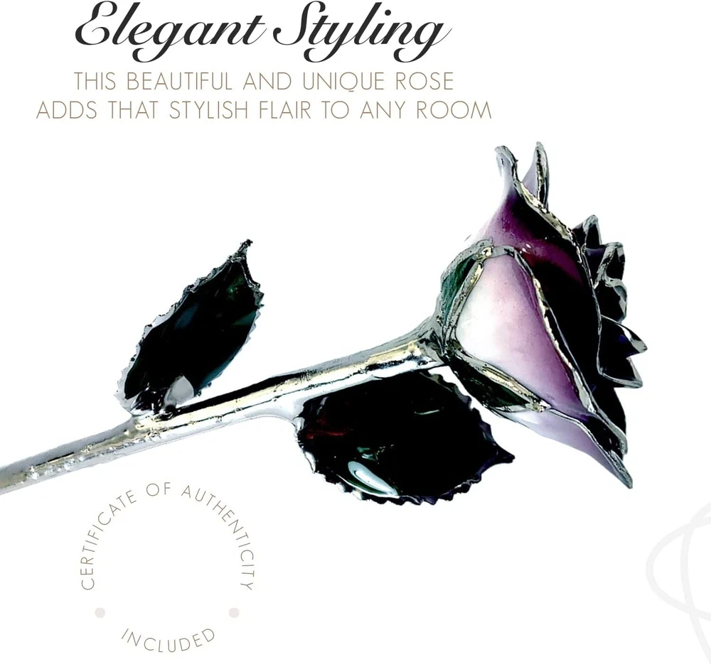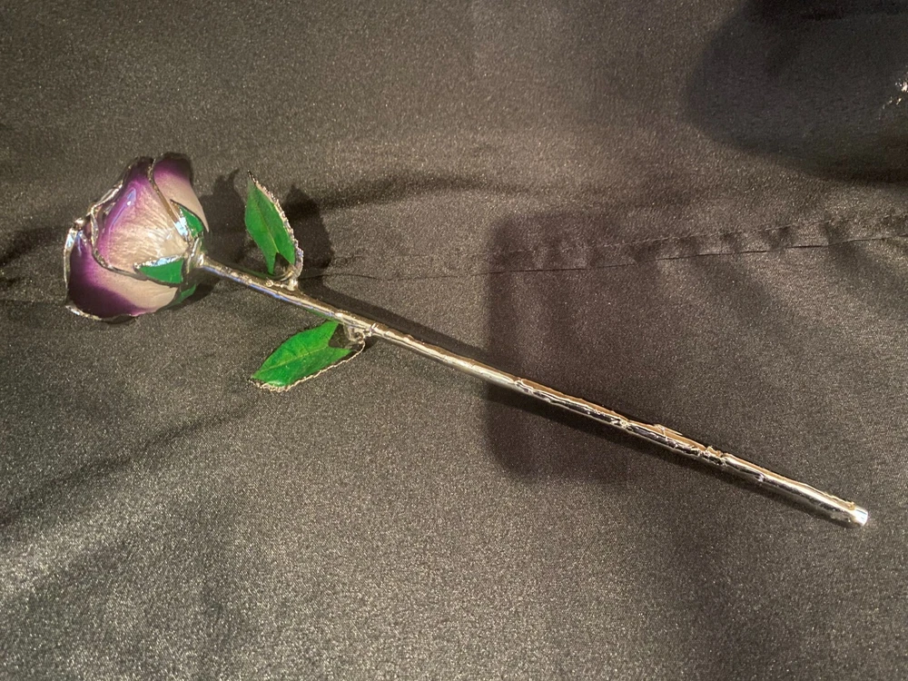 Give your love Valentine's Day roses that will last forever! Bouquets of roses are lovely but soon start to wilt and before long are simply thrown in the trash. This beautiful flower is a real fresh cut rose preserved eternally in a premium Platinum finish. No two dipped roses are alike as artisans preserve every living rose through a time-consuming 60-day process showcasing the uniqueness of each rose. The natural details of the rose bud, leaves, thorns and stem are wonderfully preserved. The beautiful deep purple hue of this rose is associated with mystique and royalty. The unique two-toned color starts with deep purple at the tips, moving to a lighter purple at the bottom. This is the perfect rose for that king or queen in your life! Looks incredible in any room with its gleaming platinum stem and accented rosebud and leaves. Your special someone will remember your love always. Looks beautiful by itself or add more Roses and a vase to create your own stunning platinum and purple bouquet.