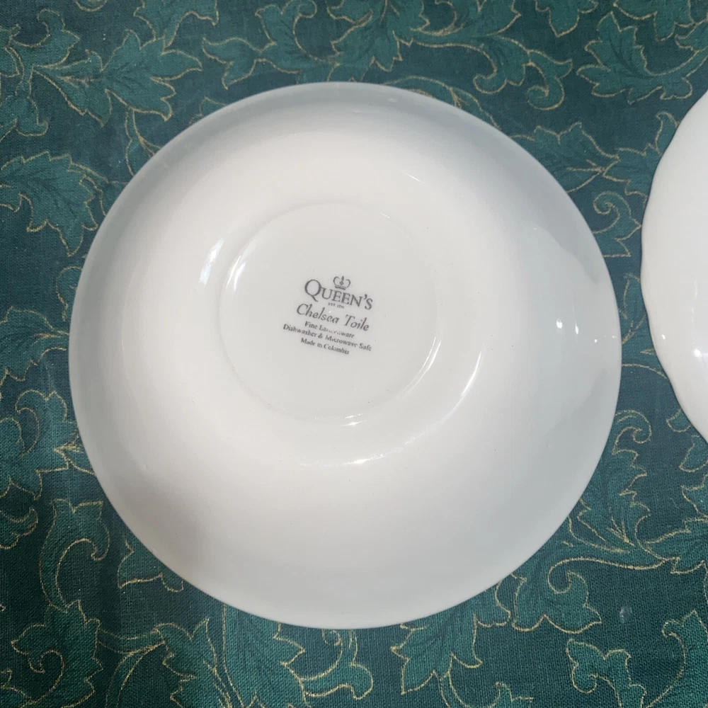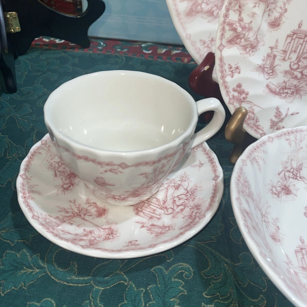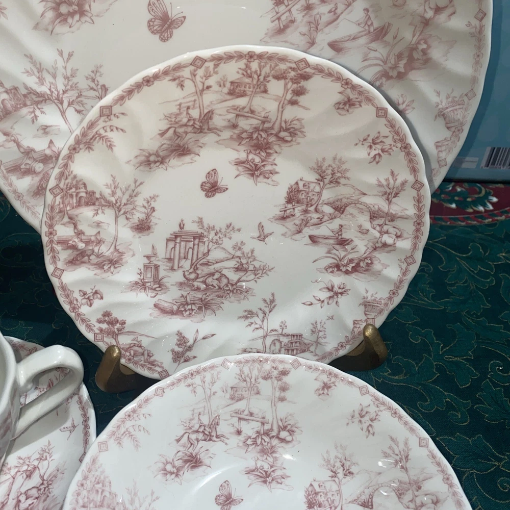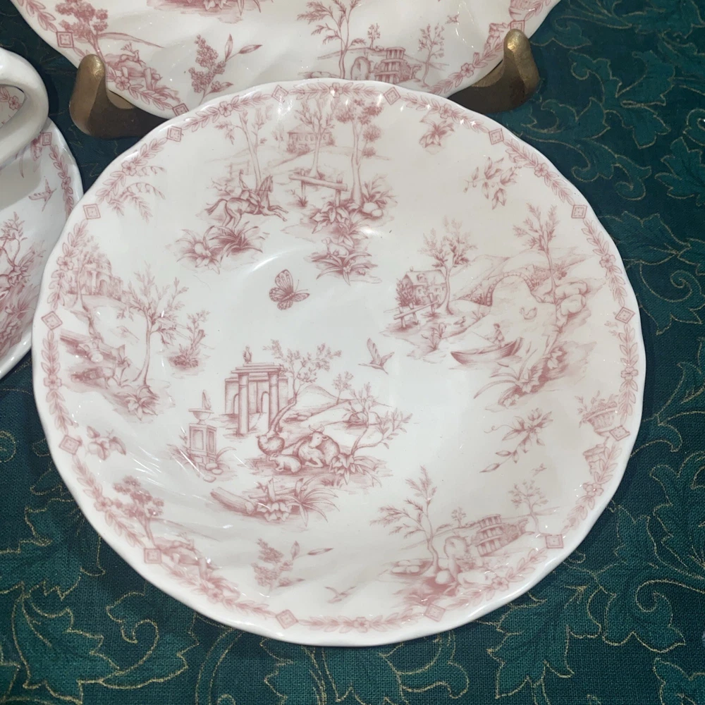 Elevate your dinner setting with this beautiful 5 piece Queens Chelsea Toile Pink White Dinner Plate set. The classic swirl pattern and elegant pink and white color combination make it suitable for all occasions. Made of high-quality ceramic, this plate set includes a dinner plate, soup bowl, sauce plate, bread plate, and cereal bowl. The Queens Chelsea Toile Pink White Dinner Plate set is part of the Queens product line and is a vintage collection that was produced in Colombia in the 1990s. These plates were studio crafted with an earthenware production style and feature a classic theme. Whether you're hosting a dinner party or looking to add some charm to your table setting, this set is a must-have.
