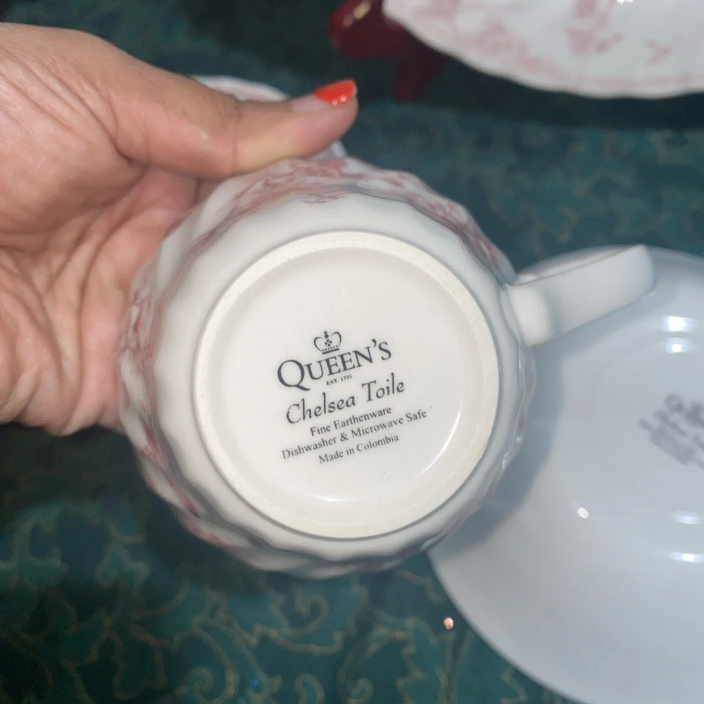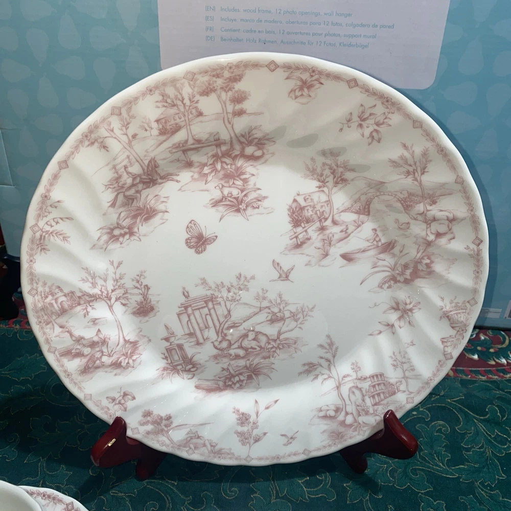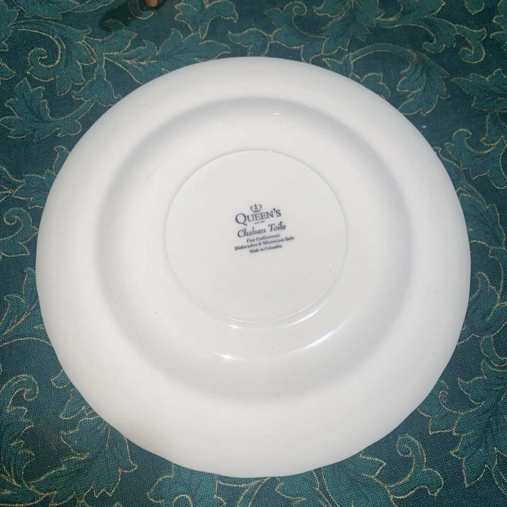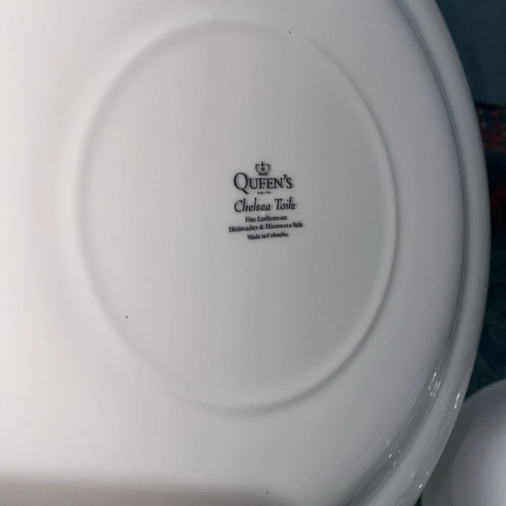 Elevate your dinner setting with this beautiful 5 piece Queens Chelsea Toile Pink White Dinner Plate set. The classic swirl pattern and elegant pink and white color combination make it suitable for all occasions. Made of high-quality ceramic, this plate set includes a dinner plate, soup bowl, sauce plate, bread plate, and cereal bowl. The Queens Chelsea Toile Pink White Dinner Plate set is part of the Queens product line and is a vintage collection that was produced in Colombia in the 1990s. These plates were studio crafted with an earthenware production style and feature a classic theme. Whether you're hosting a dinner party or looking to add some charm to your table setting, this set is a must-have.