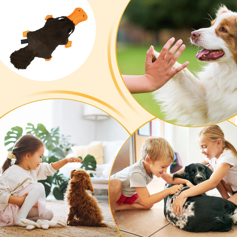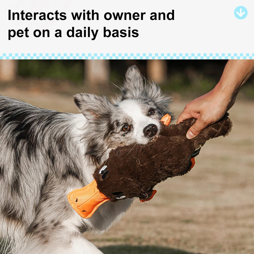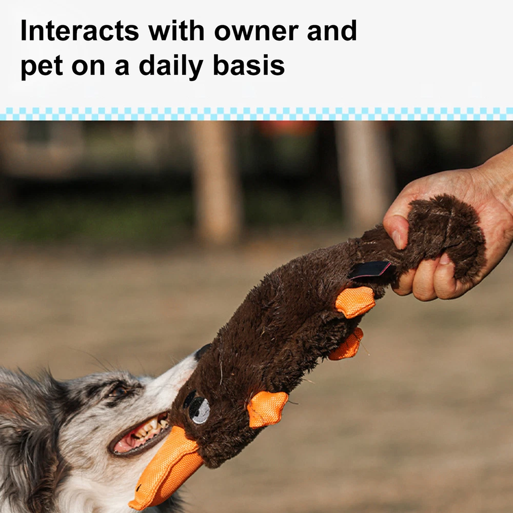 Bullet Points: Enhances Pet Interaction: Our dog plush toy is the perfect playmate that your furry friend needs. Featuring an attractive duck call, it grabs your pet's attention and prevents boredom and loneliness, while enhancing interaction and companionship with you. Its sturdy design is the cherry on top, strengthening bonds Absorbs Owner's Scent: Keep your pet entertained with a long-lasting sound emitting plush toy that absorbs your scent and effectively relax pet. With continuous sound attraction, your furry friend is sure to have a blast Increases Pet Excitement: With its original and cute design, this plush toy not only encourages playful biting but also increases pet excitement through multiple play methods, including tug-of-war compatibility Sturdy Quality: Our plush dog toys are designed with durability in mind, thanks to its high-quality workmanship and long-lasting intact design. Resisting heavy biting, this toy ensures great performance for your furry friend Brings More Fun: Your furry friend will love our plush toys for dogs that are perfect for snuggles with their cute and engaging design. This highly praised pet accessory enhances joyful playtime and is loved by owners Our dog squeaky toy is the ultimate choice for pet owners seeking enhanced pet interaction and increased pet excitement. Made with soft plush fabric and a long-lasting intact design, this toy has received high praise from pet owners. Give your furry friend the gift of playtime with this highly praised toy. Specification: Name: Dog Squeaky Toys Product weight: about 120g Product size: about 38x18x7.5cm/14.96x7.09x2.95 inches Product material: plush + Oxford cloth Packing List: 1 x Dog Squeaky Toys Notes: 1. Due to the different monitor and light effects, the actual color of the item might be slightly different from the color which is showed in the pictures. 2. Please forgive a slight measuring deviation due to manual measurement.