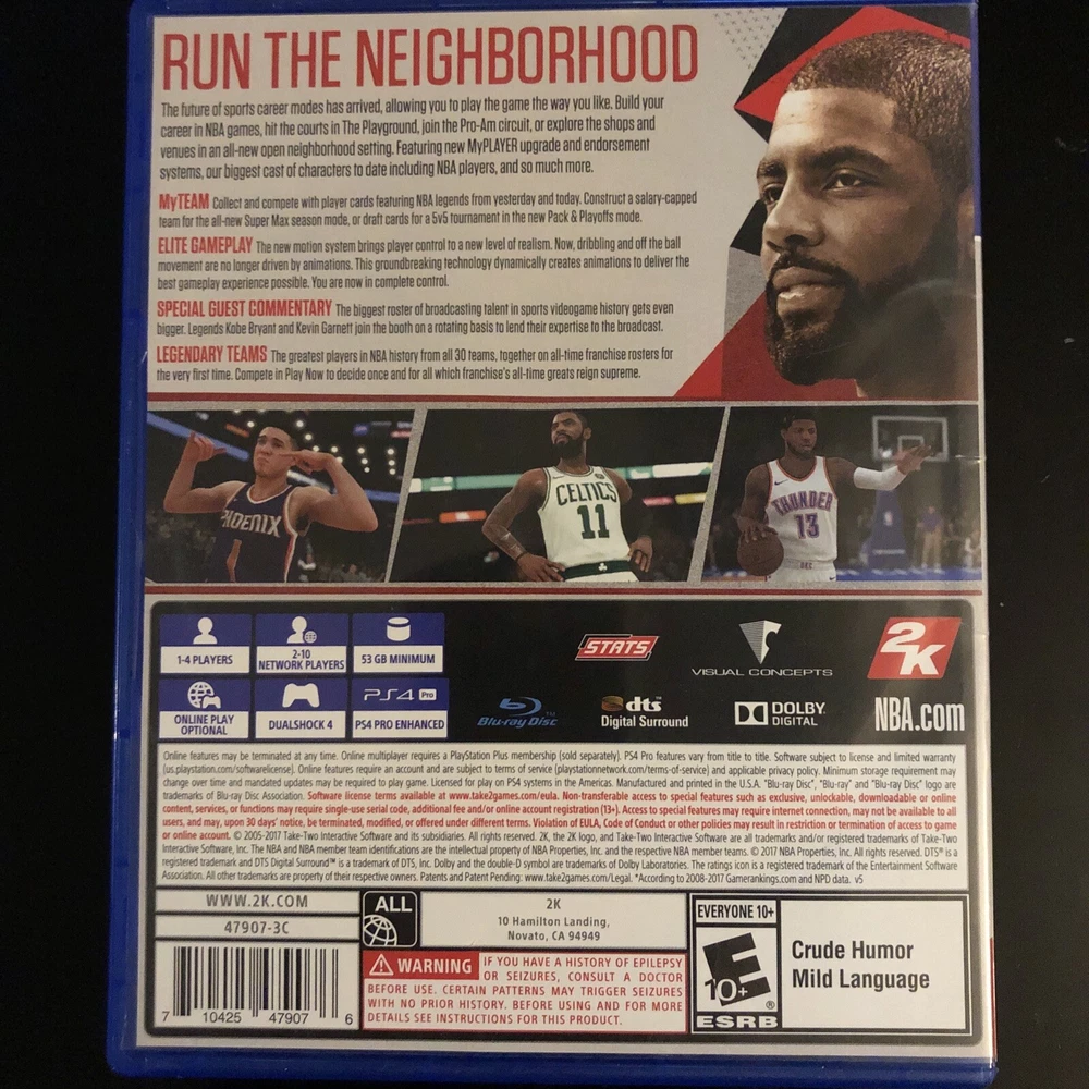 Rating: E-Everyone Region Code: Region Free Sub-Genre: Basketball Publisher: 2K Games Features: Multiplayer, Online Playability Genre: Sports Platform: Sony PlayStation 4 Game Name: NBA 2K17 Country/Region of Manufacture: United States