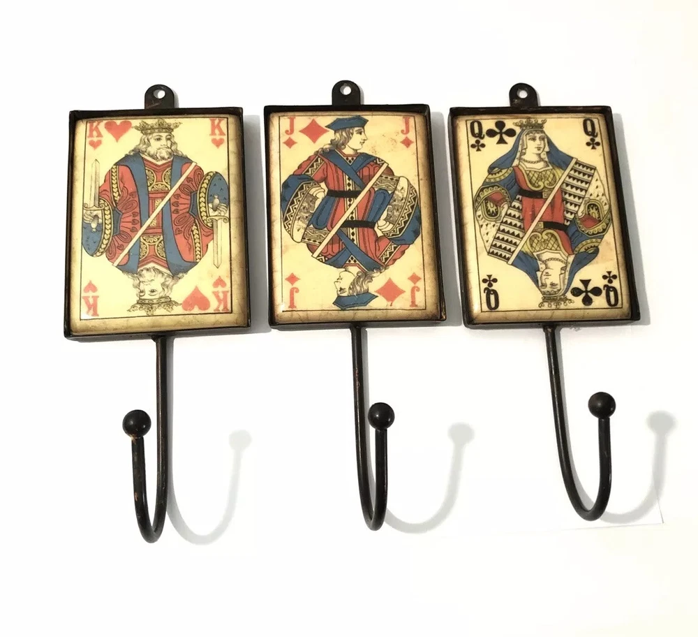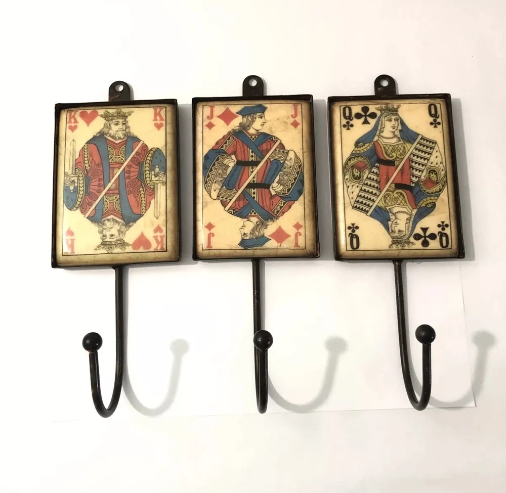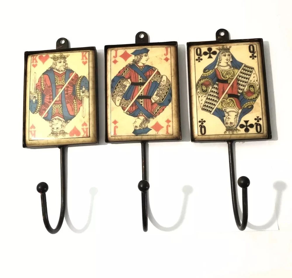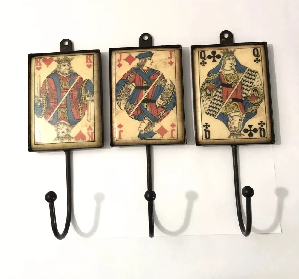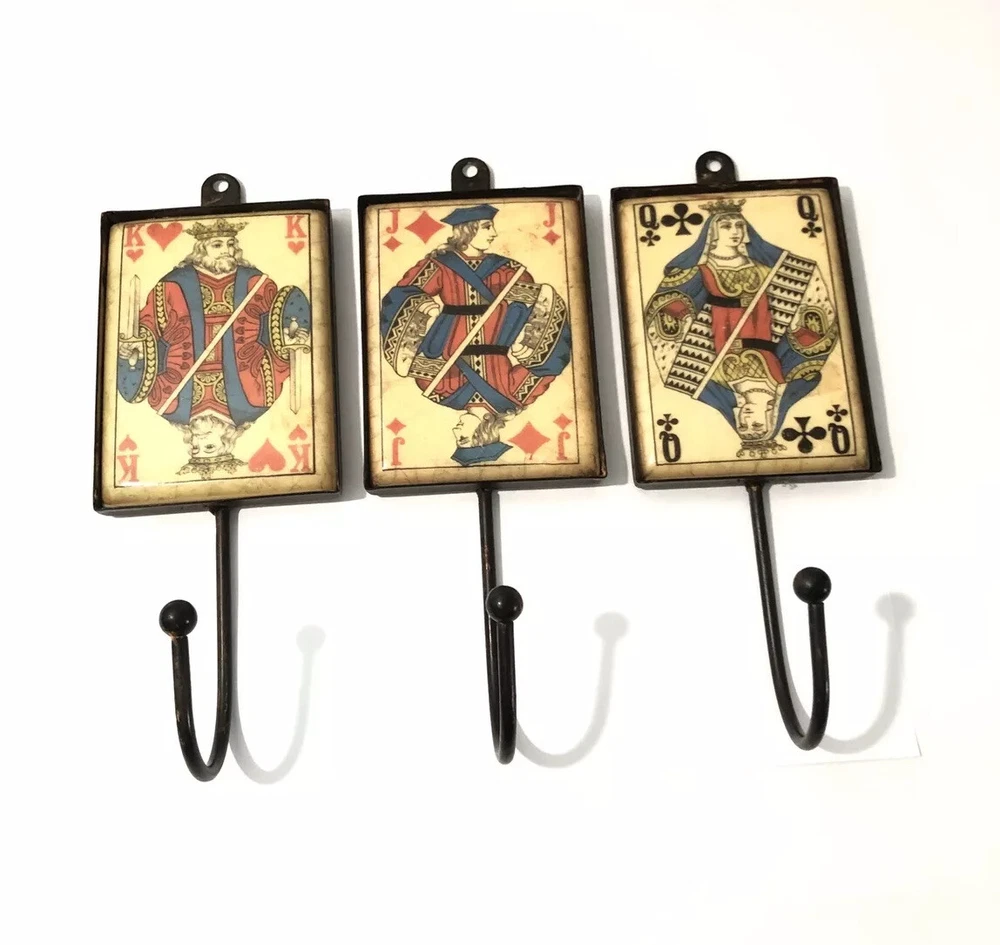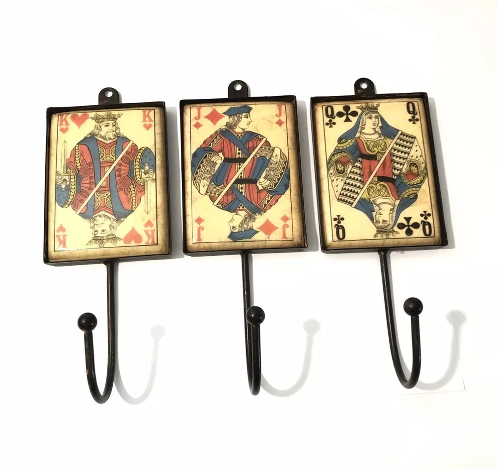 Playing Card Wall Hooks/Hangers-9” Metal & Resin- Distressed. King, Queen, Jack
