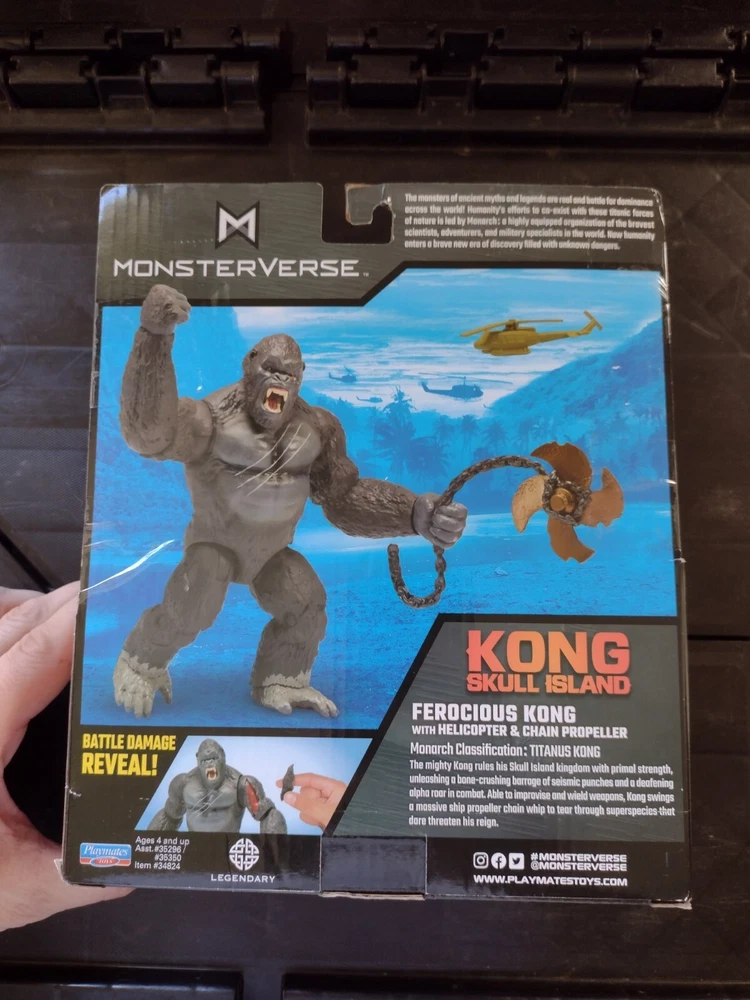 This Playmates Toys action figure is a must-have for fans of the movie Kong: Skull Island. The Ferocious Kong figure stands at 6 inches tall and comes with a helicopter and chain propeller. The figure is brand new and has never been opened. This Kong figure is part of the Monsterverse series and is perfect for all occasions. It features battle damage and is made of high-quality plastic. The figure is an original and licensed reproduction and is not a vintage item. It also does not come with any customizations. The packaging is original and unopened, making it a great addition to any collection.