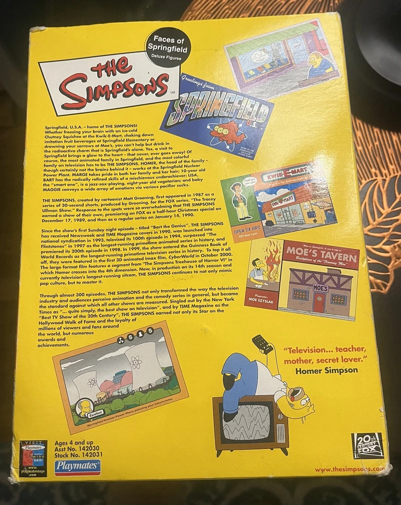 Featured Person/Artist:SealScale:1:9Color:MulticolorSigned:NoBrand:Playmates ToysMaterial:PlasticPersonalize:NoMPN:142031UPC:043377420316Features:BoxedCharacter:Homer SimpsonCountry/Region of Manufacture:Chinagtin13:043377420316Year Manufactured:2002Type:Action FigureSport:BoxingOriginal/Licensed Reproduction:OriginalTime Period Manufactured:2000-2009Vintage:NoFranchise:The Simpsons