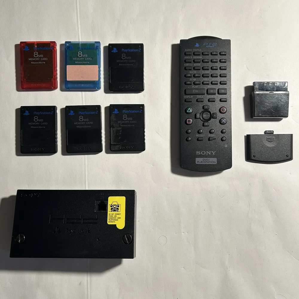 (All items are tested and fully functional, the memory cards have many game saves currently on them if your interested, combined shipping on all items.) Enhance your gaming experience with this set of PlayStation 2 accessories, including memory cards, a network adapter, and a wireless TV remote control. These accessories are designed specifically for the Sony PlayStation 2 platform and are compatible with PS/2, infrared, Ethernet, and RF switch connectivity options. The memory cards are made of durable plastic material and come in black color with glossy and matte/anti-glare features. The network adapter has a wireless range of 10-15 feet and is ergonomically designed for comfortable handling. The wireless TV remote control also has a wireless range of 10-15 feet and is compatible with DVD TV viewing options. This set of accessories is perfect for any PlayStation 2 enthusiast looking to take their gaming experience to the next level.