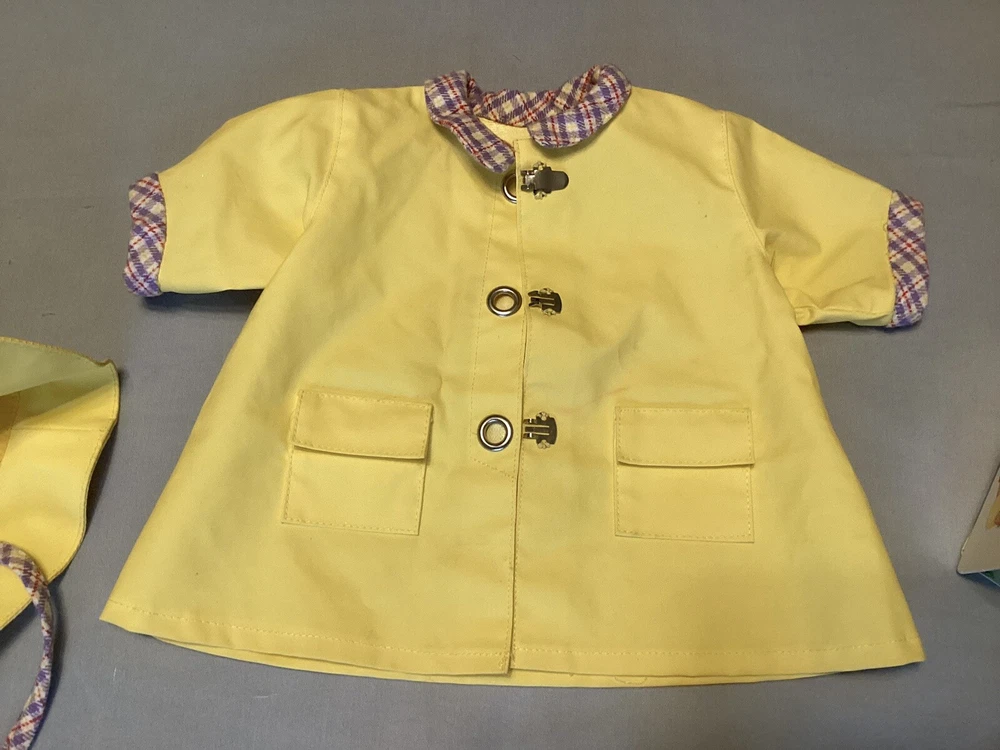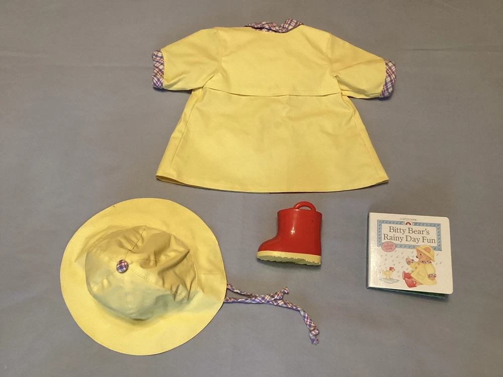 Pleasant Company (American Girl) Bitty Baby Rainy Day Set from 1999, partial. Includes the raincoat, hat, one boot, & the book. There are faded red marks on the coat, and two of the latches are broken. The boot is a left, and it has some small scuffs on it as well. Check out my page for more American Girl & Pleasant Company!