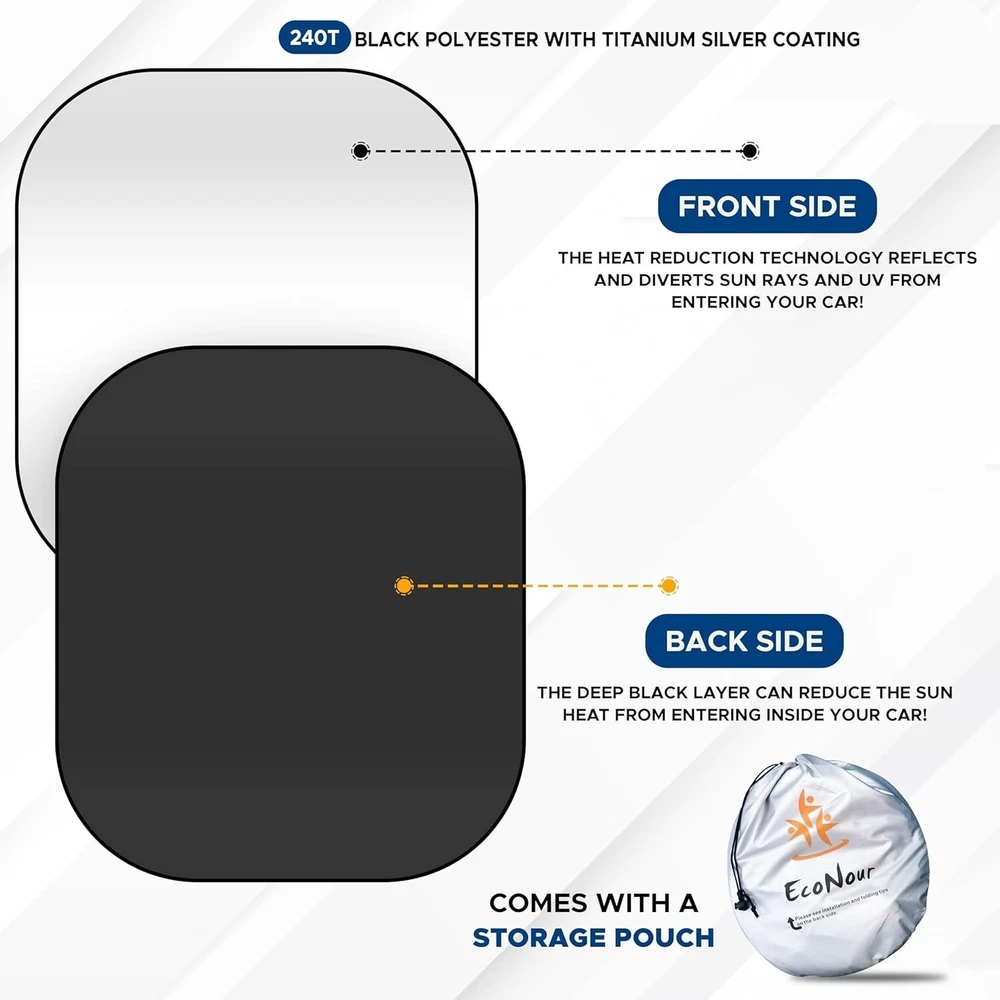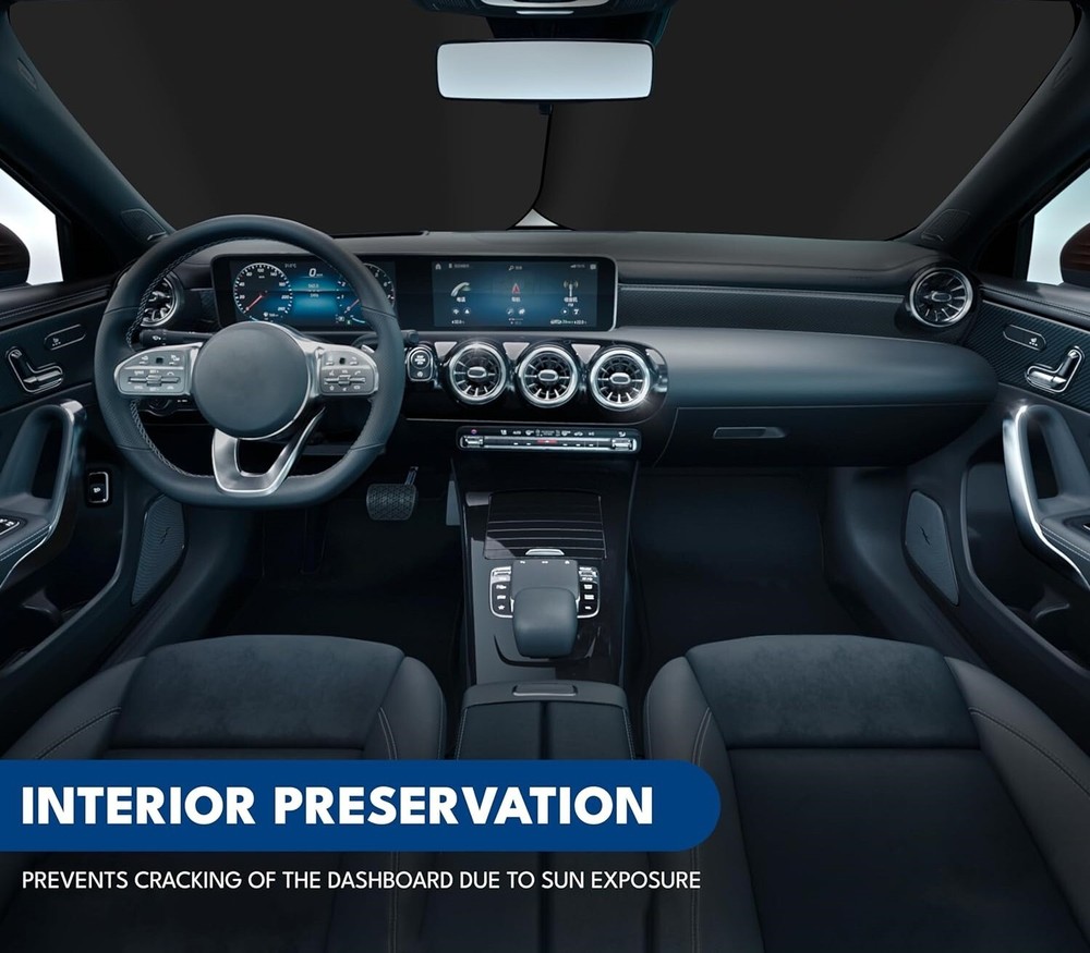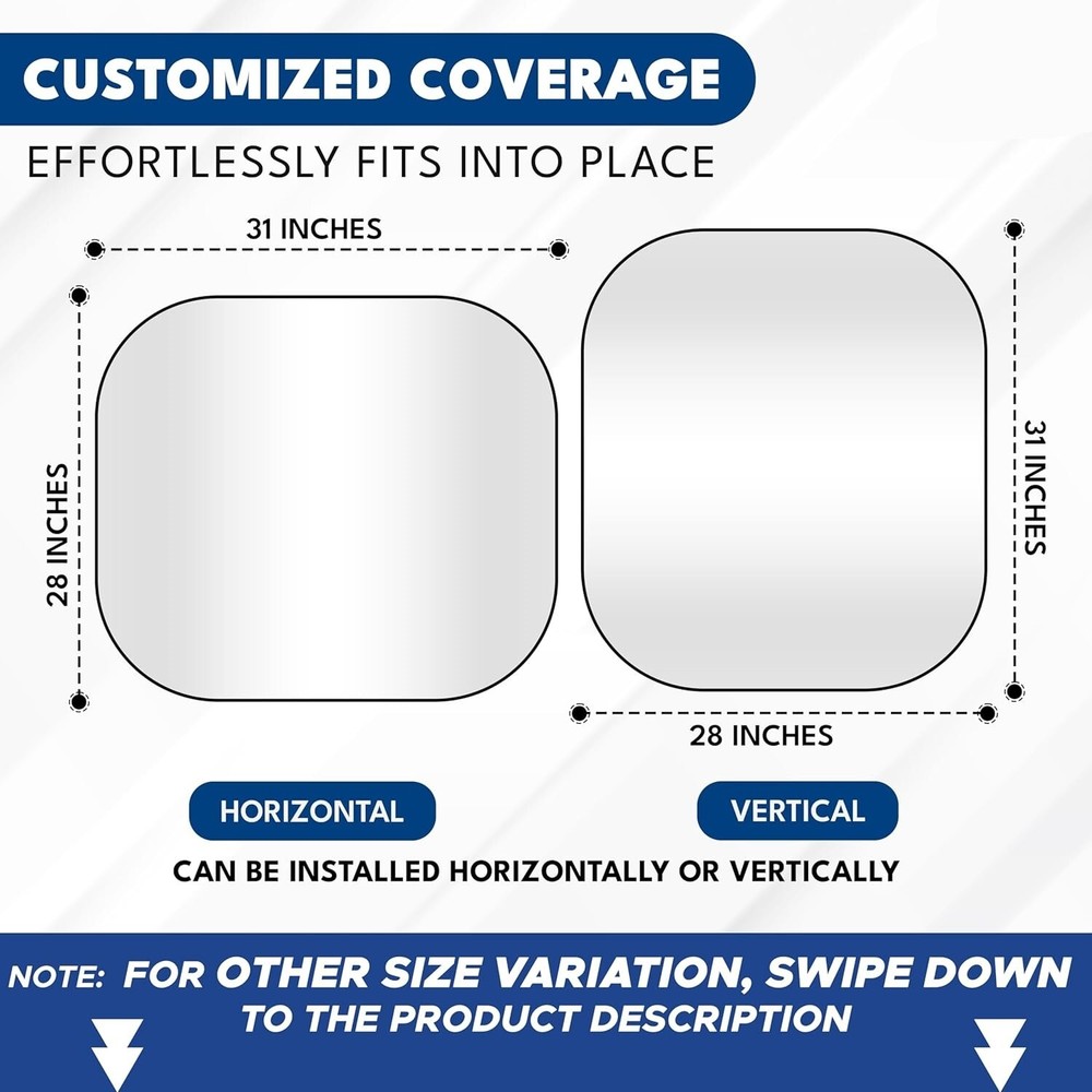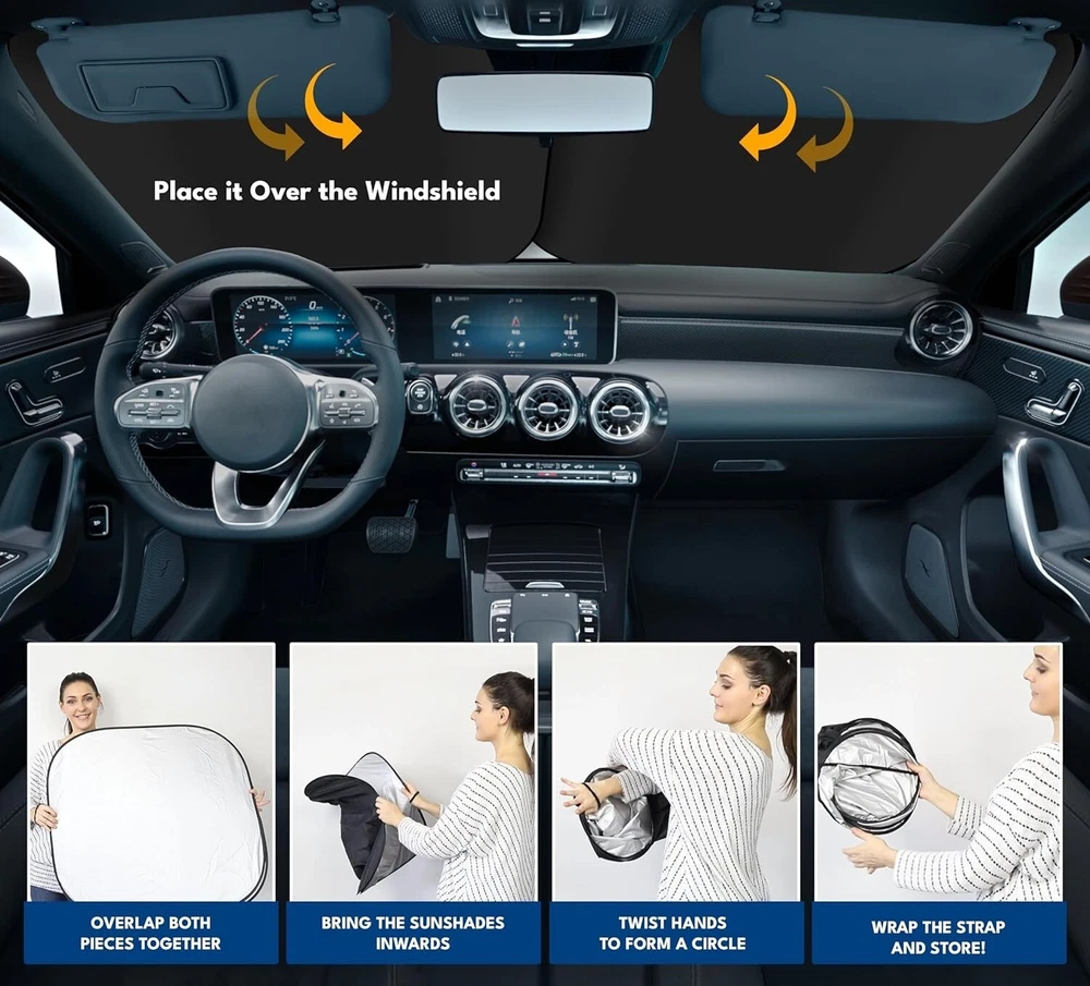 Parasol Para Coche, Cubierta De Parabrisas UV, Plegable, Aislamiento Térmico AC. Protección solar superior: experimente una protección solar incomparable con el parasol para parabrisas de automóvil, que protege el interior de su vehículo, incluidos los asientos, el tablero y los dispositivos electrónicos, contra el calor implacable y los dañinos rayos UV. Precisión a medida: garantice un ajuste impecable en todo momento con el parasol para parabrisas delantero del automóvil, meticulosamente diseñado para cubrir todo el parabrisas. Su diseño versátil de 28x31 pulgadas, compuesto por dos piezas entrelazadas, permite una instalación perfecta en orientación horizontal o vertical, brindando un ajuste personalizado para su vehículo. Artesanía inigualable: nuestro parasol bloqueador solar para automóvil cuenta con una durabilidad y calidad excepcionales. Construido con material de poliéster 240T reforzado que refleja los rayos UV, bloquea eficazmente el calor, reduce el deslumbramiento y preserva el interior de su automóvil, brindando una protección confiable en cualquier clima. Comodidad de conducción mejorada: diga adiós a las temperaturas abrasadoras y dé la bienvenida a un viaje más agradable con la protección solar interior del automóvil. Al reducir la temperatura de la cabina, se crea un ambiente más fresco y confortable, mejorando su experiencia de conducción incluso en los días más calurosos. Solución de almacenamiento sin esfuerzo: cuando no esté en uso, guarde cómodamente el parabrisas delantero del parasol retráctil del automóvil en su bolsa de almacenamiento compacta. Diseñado para un almacenamiento fácil y eficiente, cabe perfectamente en el bolsillo de la puerta o en el tablero de su automóvil, lo que garantiza un acceso rápido cuando sea necesario.