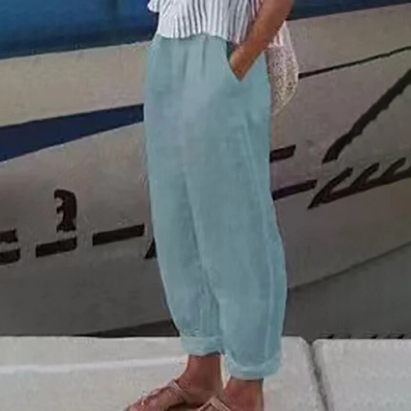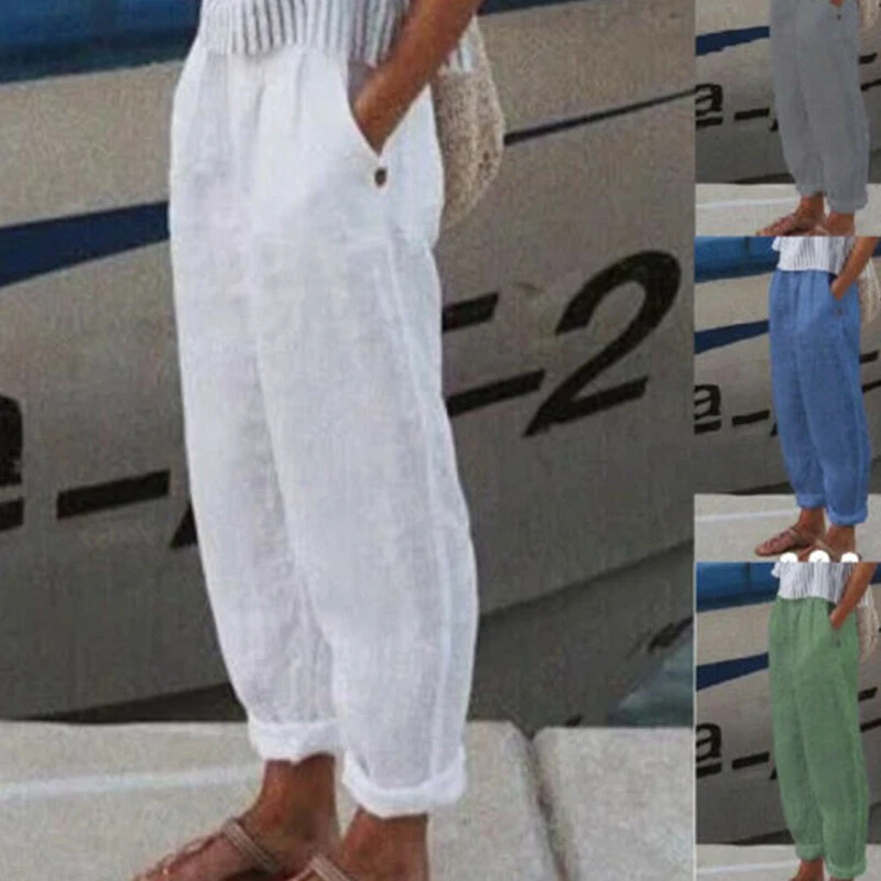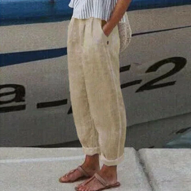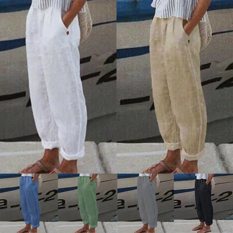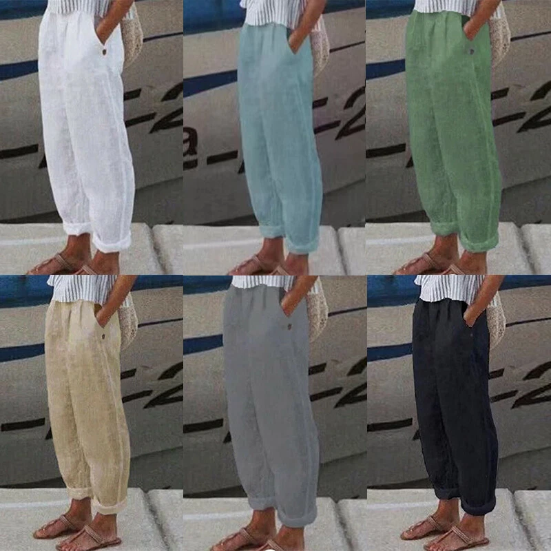 ☆Plus Size Ladies Cotton Linen Casual Long Pants Womens Solid Straight Trousers