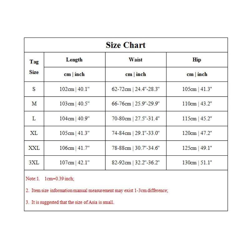 Specifications: 100% Brand new and high quality. Size:S,M,L,XL,XXL,3XL Color: white,khaki,grey,black,light green,light blue Material: Polyester Waist Type: high Pattern:solid color Season:summer Note: 1.Due to the light and screen difference, the item's color may be slightly different from the pictures. Please understand. 2.Please allow 2-3% error due to manual measurement.Please make sure you don’t mind before you mid. 3.Size doesn’t fit all.Please carefully check size chart and select the size based on your real size. Care Instructions: Wash before wear Cold gentle machine wash Do not bleach Do not tumble dry Drip dry Package:1 pcs women pant Size Chart Tag Size Length Waist Hip cm | inch cm | inch cm | inch S 102cm | 40.1'' 62-72cm | 24.4''-28.3'' 105cm | 41.3'' M 103cm | 40.5'' 66-76cm | 25.9''-29.9'' 110cm | 43.2'' L 104cm | 40.9'' 70-80cm | 27.5''-31.4'' 115cm | 45.2'' XL 105cm | 41.3'' 74-84cm | 29.1''-33.0'' 120cm | 47.2'' XXL 106cm | 41.7'' 78-88cm | 30.7''-34.6'' 125cm | 49.1'' 3XL 107cm | 42.1'' 82-92cm | 32.2''-36.2'' 130cm | 51.1'' Note:1. 1cm=0.39 inch; 2. Item size information manual measurement may exist 1-3cm difference; 3. It is suggested that the size of Asia is small.
