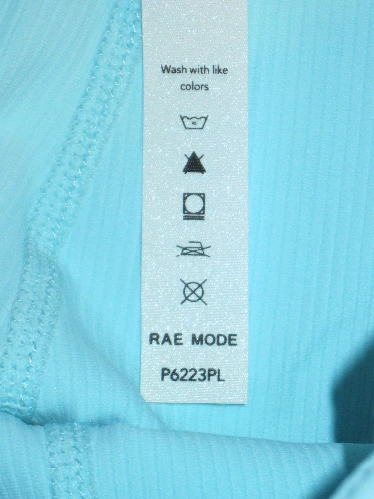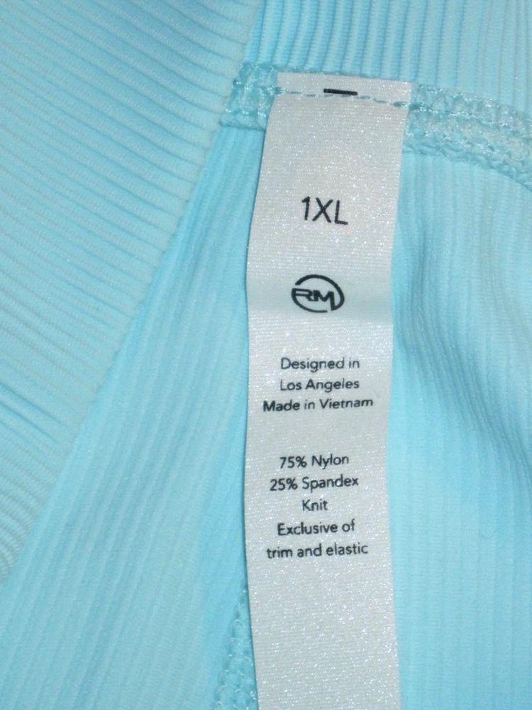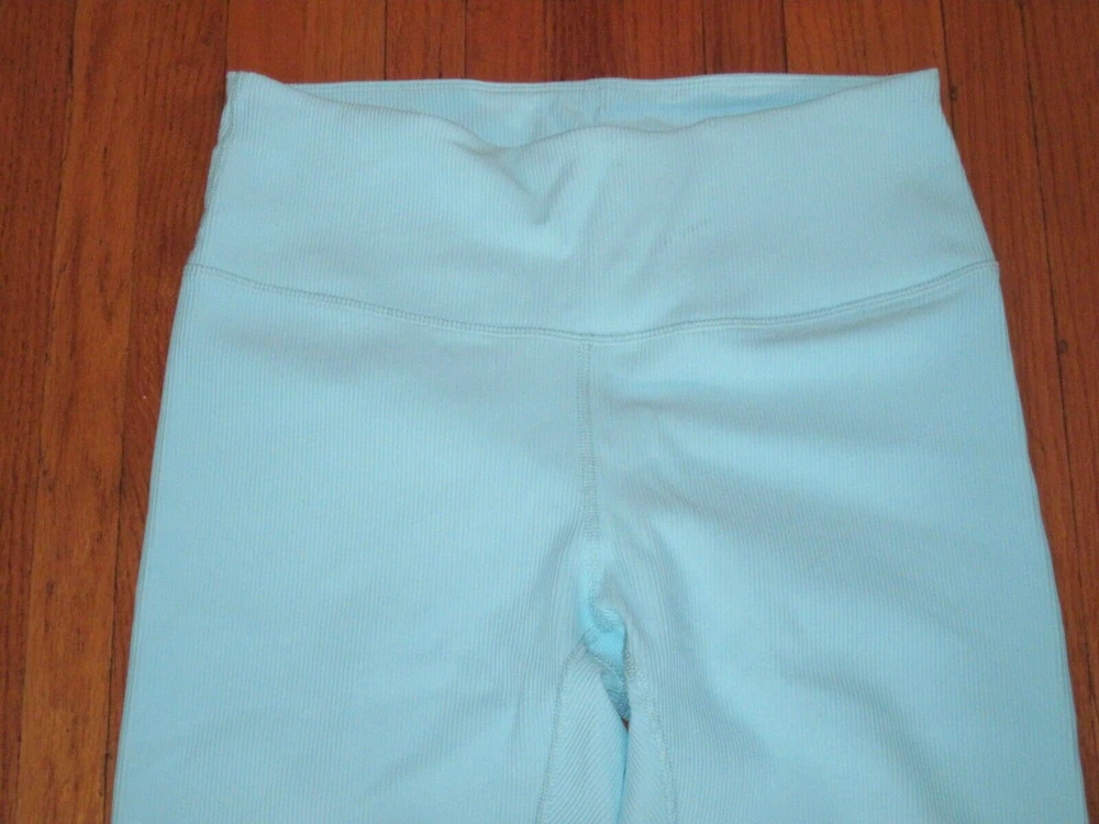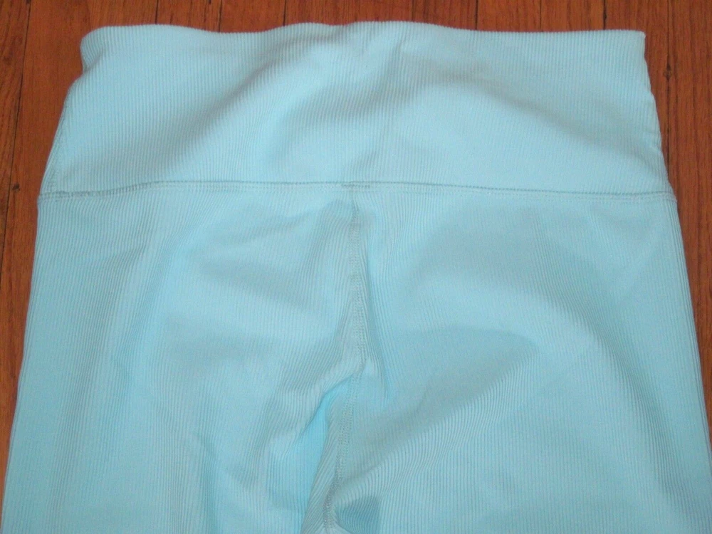 Plus Size Rae Mode Lt. Blue Ribbed High Rise 7/8 Yoga Fitness Leggings Size 1XL New. Relaxed 30-inch elastic waist, 4-inch wide waistband with left front slot pocket in waistband. 26-inch inseam. Made of 75% Nylon, 25% Spandex. Come from a pet free smoke free home.