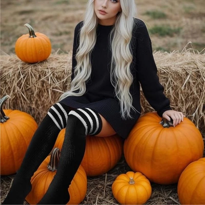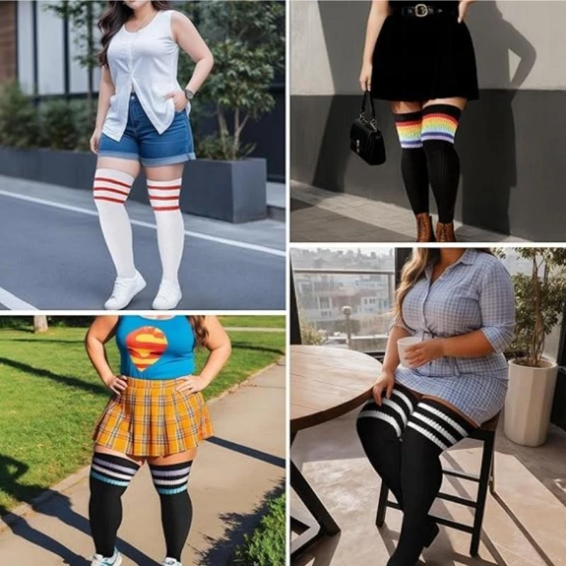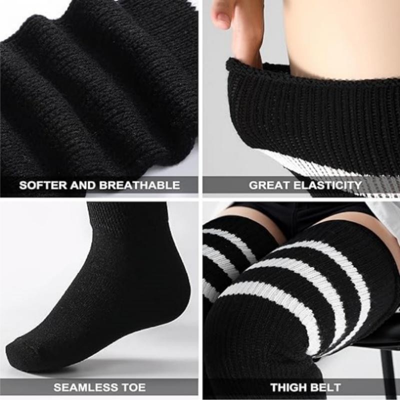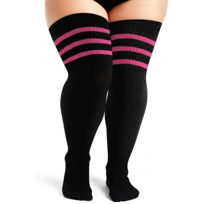 [Truly Made for US Cute Girls] : Our thigh high socks are designed with plus size in mind! The size of our thigh highs socks are enlarged and widened, which is completely suitable for big girls. The plus size thigh high stockings are about 35'' long, the stretched length is about 42'', about 7'' wide, and the stretched width is up to 39" circumference. If your upper thigh measures smaller than 25'' and these socks may too big for you. [Coming with Extra Long Thigh Garter] : Say goodbye to annoying body adhesives and the embarrassment of sagging or rolling off. If you want to fixed the plus size socks to any length you want, I think you'll love the thigh garter. The matching thigh straps' width are adjustable and they can stretch up to 44.5'' circumference, they are super elastic and you can adjust them to suit your needs. [Breathable High Elastic & Slip into Comfort] : The plus size thigh highs are made of soft acrylic yarn fabric to keep you and your legs warm and comfortable! Soft and high elastic material fits snugly to your calves and thighs. Make your legs look longer without suffocating your thighs. These extra long thigh high socks can bring you the freshness of early spring, romance of fall, warmth of winter and confident beauty of women. [Various Wear Ways & Show Fashion] : There are many ways to wear our plus size striped thigh high socks! They wrap around your beautiful thighs like cute leg warmers or fold up into over the knee socks! Wear it with shorts, jeans or mini pleated skirts for a casual dress, high or ankle boots on fall or winter, and a variety of uniforms for party! You can also wear our comfortable socks for yoga, cosplay, roller Derby, pole dancing, and even as you hang out at home! [Best Gift and Choices for Big Girls] : Our womens high socks are the perfect gifts and accessories for Birthday, Mother's Day, Christmas, Halloween, New Year Day or Thanksgiving Day. And we are committed to providing you with a happy shopping experience. If missing thigh garter or any defective problems, please contact us to help you and we will reply to you within 24 hours.