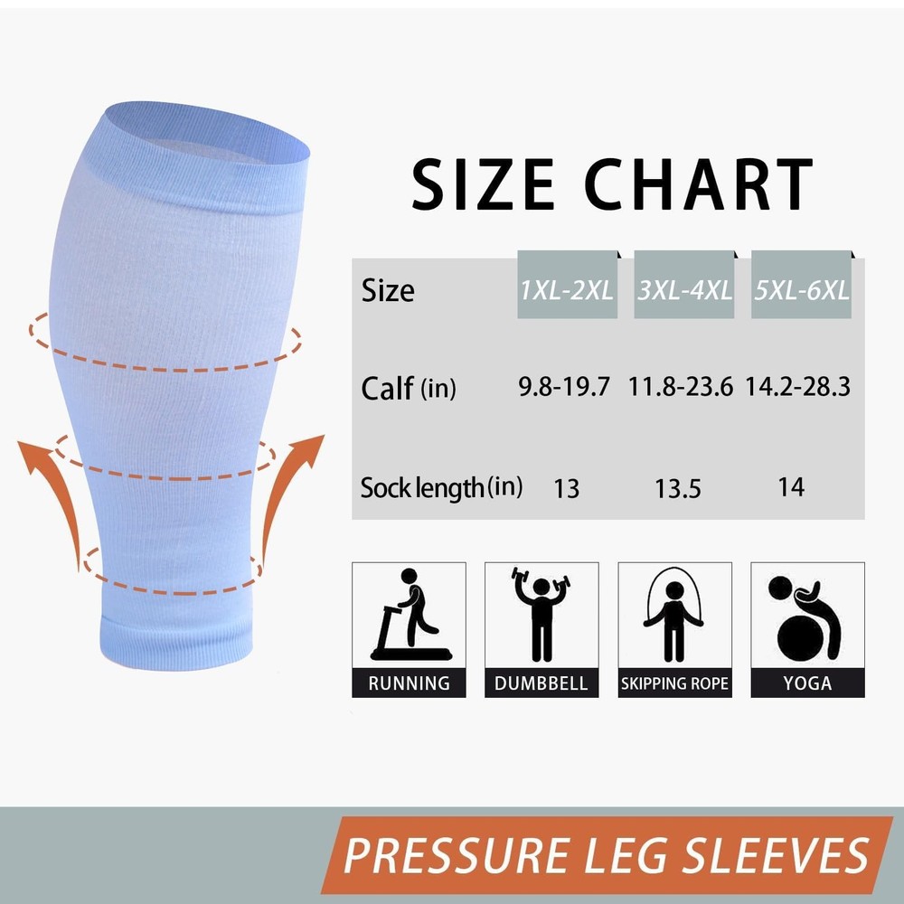 Plus Size Compression Leg Sleeves for Women& Men Wide Calf Knee High Leg Sleeves Plus Size design: Plus size calf compression sleeves are designed for men and women with wide calf. Leg compression sleeves are available in 1XL-2XL, 3XL-4XL and 5XL-6XL sizes to meet the needs of most people. Please refer to the data size chart for selection.