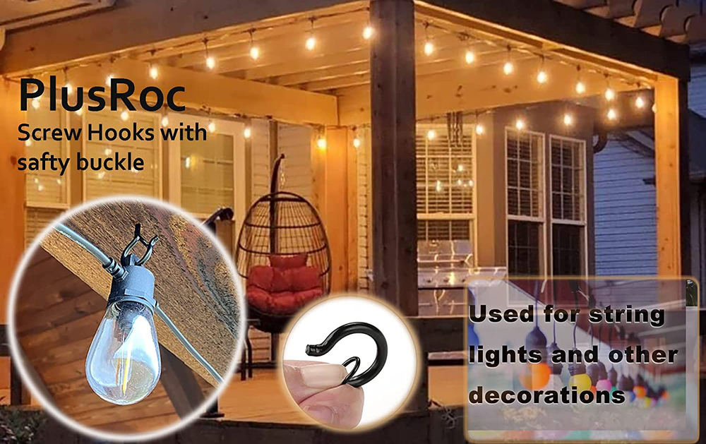 Store New Arrivals Add to Favorite View Feedback Plusroc 20 Pack Screw Hooks for Hanging Plants Outdoor Lights, Heavy Duty 2.2 Inch Black Eye Hook Screw Cup Ceiling Hook Q-Hanger for String Lights, Wall Wood Ceiling Deck Mount Description Style Safety Buckle Pattern Safety Buckle Design Country of Origin China Warranty Description 1 year warranty Theme Home Decoration Batteries Included? No Batteries Required? No Finish Iron Brand PlusRoc Material Iron Maximum Weight Recommendation 40 Pounds Minimum Weight Capacity 40 Pounds Number of Hooks 20 Maximum Weight Capacity 40 Pounds Finish Type Iron Package Dimensions 6.18 x 5.16 x 0.55 inches Manufacturer PlusRoc Item Package Quantity 20 Item Weight 1 pounds Surface Recommendation Wood or Concrete Special Features Heavy Duty, Rust Resistant Special Feature Heavy Duty, Rust Resistant Weight Limit 40 Pounds Mounting Type Ceiling Mount Color Black Shape Black Eye Recommended Uses For Product Ceiling,Wall,Screw Hooks,Indoor,Outdoor Included Components 20 x screw in ceiling hooks(black), 20 x drywall anchors and instructions Package Includes: 20 x screw in ceiling hooks(black) with safety clips, 20 x drywall anchors and instructions. Safety Buckle Design: Plusroc plant hooks with strong clips lock securely and release easily. No risk of the lights/plants/baskets/wind chimes falling off even in windy days! Good for both outdoor and indoor use. Widly used for hanging plants outdoor, string lights, fairy lights, rope lights, planters, plant baskets, wind chimes, bird feeders, lanterns, christmas wreath and other decorations… Easy Installation: Drill a pilot hole, insert the drywall anchor if needed and then screw in the hook. Great for eave, patio, deck, gazebo, pergola, ceiling, walls, wood or tree, fence, planters, plant basket… Sturdy and Durable: Eye Hooks are made of quality iron and coated with antirust paint, each hook holds up to 40lbs. Tips: 1. When installing horizontally, screw it into the wall until the clip hole touches the surface to enhance load capacity. 2. These hooks contain functional sharp points, please keep them out of children's and baby's reach. Product Description Sturdy screw in hooks for Hanging Plants, String Lights, Outdoor Lights, Christmas Lights, Fairy Lights, cups, wind chimes..... For Hanging Christmas Lights/ holiday decorations Windproof and weather resistant Easy to clip on/off For Hanging String Lights Indoor and Outside Wall/ceiling/fence mount Commonly used in daily life: for hanging lights in patio, bistro, gazebo, pergola, eave, garden, pool, party... For Hanging Decorations Max Load : 40 lbs per hook Quick installation Sharp Tip Easy to screw in soft wood by hand. Stay secure once properly installed. Made to last. Safety Buckle Design It's easy to open and close. Keep your hanging items safe in windy days. Max Load: 40 Lbs each hook. A Wing Nut Driver for 40 pk/60 pk Hooks 1/4'' Wing Nut Driver will help you install the hooks efficiently. Predrill holes and use wall plugs when needed. WARNINGS: 1.These hooks contain functional sharp points, please keep them out of children's and baby's reach. 2.To reduce the risk of items falling, please make sure the weight of the hanging items is less than 40lbs. 3.When installing horizontally, screw it into the wall until the clip hole touches the surface to enhance load capacity. ABOUT US We offer the best prices around on high quality products. Our E-store includes media such as books, movies, music and games while offering electronics, toys, sporting apparel, clothing, tools, general home, garden items and more. SHIPPING We are always working hard to ensure your package arrives as soon as possible. Please understand that some factors like weather, high postal traffic, and the performance of shipping companies are outside of our control. We offer free shipping to the lower 48 states and ship within 2 business days of payment, usually sooner. We do not accept P.O. Boxes. Please provide a physical address. RETURNS We offer a 30-Day Return Policy on items which you are not completely satisfied with. You have the option for a full-refund or an exchange of the item. No returns are available on items shipped outside of the USA. PAYMENT We accept PayPal. CONTACT US This page content is yet to come Please ad us to your favorite seller and visit again later Thank You