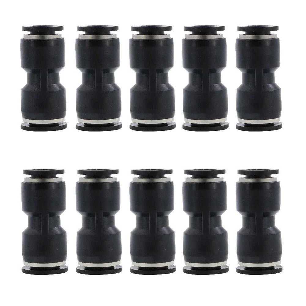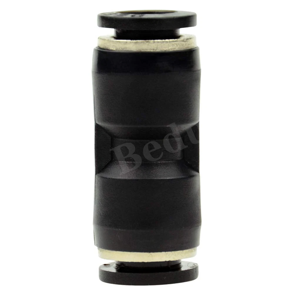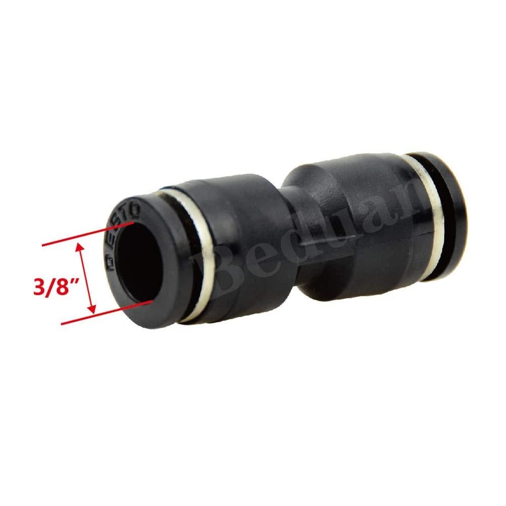 Pneumatic Fittings are a compact one piece push-to-connect fitting. All items in the Pneumatic composite range are silicone free. The Stainless steel gripping ring ensures excellent tube retention while the D seal within the fitting provides a positive seal on the O.D. of the tube, in both static and dynamic positions, due to an optimized design of the fitting cavity. Pneumatic composite should not be used for live swivel applications Body and collar are made of Nylon 6.6, gripping ring is stainless steel, and D seal and O-rings are Nitrile. Type:Push in fitting/Push to connect / Size:3/8" Straight Union Connector Fluid Admitted:Air Vacuum Water (no freezing) Working Pressure:0-1.0MPa | 0-150psi/Applicable Tube:PU / PA / PE / PVC Proof Pressure:3.0Mpa | 435psi.Seal O-ring:NBR/ Lock Claw:Stainless Steel(SUS)/Body:Plastic(PET) Working Temperature:0-60°C | 32~140°F/Negative Pressure:-100Kpa | -29.5 In Hg