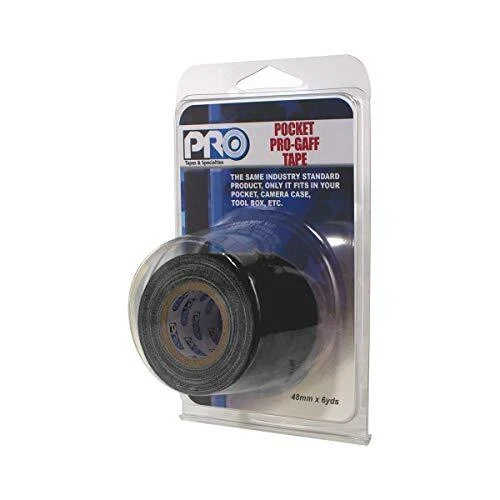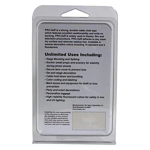 Pro Gaff by is a professional grade 11-mil matte cloth gaffers tape used widely in performance spaces commonly to mark stages, label equipment cases and temporarily hold lighting or cables throughout performances. It’s rubber-based adhesive makes it easy to tear, hold tight and remove cleanly from most surfaces. Pro Gaff is weather resistant and can be used outdoors in temperatures up from 50 – 200 degrees Fahrenheit with a tensile strength of 45 lb. per inch. This makes it an excellent choice as a general-purpose tape to have on hand and useful in almost any application. Pro Gaff is also commonly referred to as gaffe, gaffer or gaffers tape. Pro Gaff is manufactured in the USA by & Specialties, For over 40 years, has been a leader in pressure sensitive adhesives. Black 11-mil Premium Heavy-Duty Professional Gaffers Tape. Highly versatile. Can be used for temporary holding, color coding, labeling and marking stages. Easy to tear by hand (in both directions), holds tight and easy to remove. Removes cleanly from most surfaces. Highly conformable to irregular surfaces. Pro Gaff gaffers tape is for indoor / outdoor use in temperatures ranging from 50 – 200 degrees Fahrenheit. This gaffer tape measures, 2 inches by 6 yd. and is made in the USA by .
