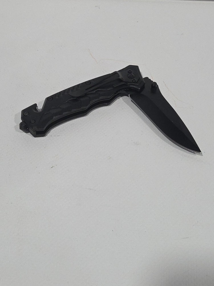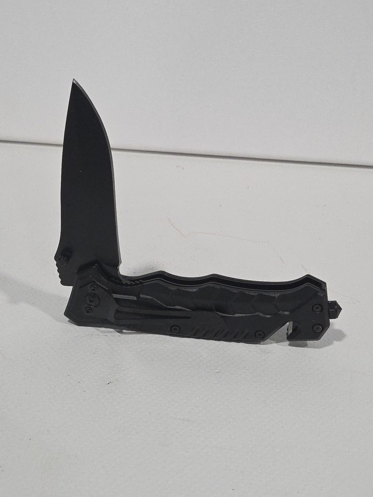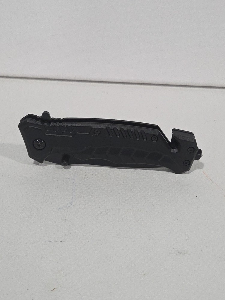 The pocket knife is a tactical spring-assisted folding knife with a drop point blade made of stainless steel. It features an ambidextrous opening mechanism and a black steel handle. The blade edge is approximately 2.9mm thick, making it suitable for various cutting tasks. The knife is 8 inches in length and has a bearing knife shaft lock for secure handling. It is designed for military use and comes in its original packaging.