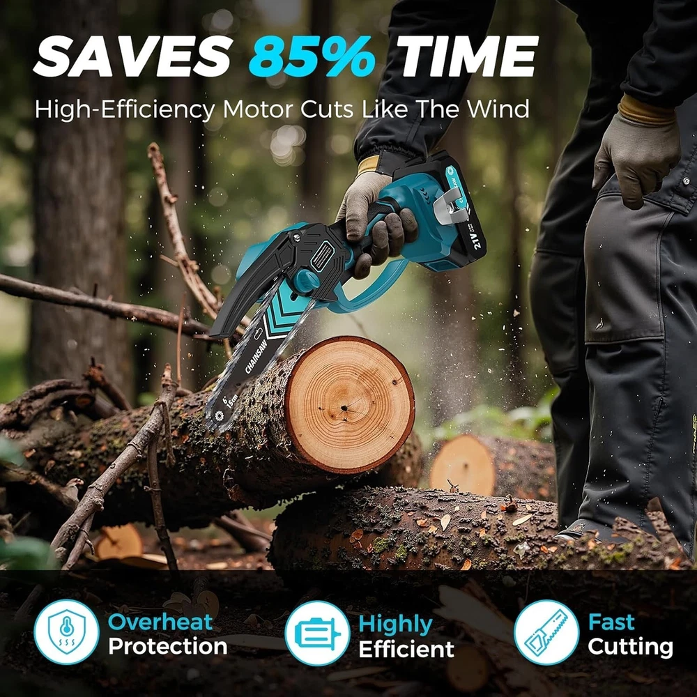Highly Efficient & Fast & Precise Cutting: High-hardness alloy steel blades and chains, processed through quenching, combine with an upgraded coating to significantly enhance the sharpness and abrasion resistance of our chainsaw. It effectively handles branch-cutting tasks at a high speed. With a 90% improvement in working efficiency, this electric chainsaw saves you time and effort, making it pretty user-friendly. Ultra-Powerful Pure Copper Motor: Our electric chainsaw, driven by a high-power pure copper motor, easily cuts through logs, bamboo, or branches. It delivers strong cutting force with stable, peak performance and a quick-start function. The overheating protection system ensures safety and extends the motor lifespan. Long-Lasting Operation after Fully Charging: The mini chainsaw operates for about 40 to 60 minutes on various cutting tasks, thanks to its 21V 2000mAh rechargeable lithium battery. This battery charges quickly, eliminating the hassle of lengthy or frequent charging. It also displays the current power level (0%-25%-50%-75%-100%), reminding you to recharge and preventing interruptions during use. Multifunctional & Exquisite Electric Chainsaw: To improve safety, clarity and efficiency, the tree chainsaw is equipped with an automatic LED light supplying essential illumination in dim environments. A safety handlebar and dual switch locks complement each other to prevent accidental activation during use. Note: To turn on the chainsaw, press both the start and safety switches simultaneously. Pretty Lightweight & Portable & Flexible: Our cordless chainsaw is pretty lightweight and compact, making it easy to carry and store. It operates efficiently with one hand, providing super flexibility and portability for outdoor cutting tasks, making it a popular choice for those with less strength.
