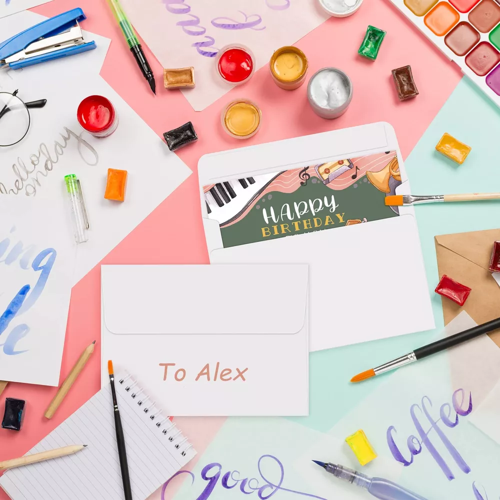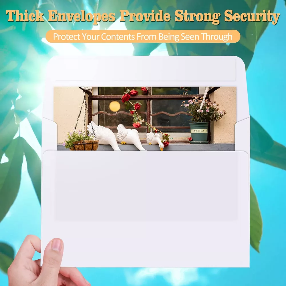 Set of 120 Pack A6 Invitation Envelopes: Poever A6 invitation envelopes set includes 120 pack white envelopes and a sturdy box for shipping protection and easy storage. Each A6 invitation envelope measures 6.5 x 4.75 inches, perfect size for greeting cards, holiday cards, photos, postcards, invitations, letters, announcements, thank you notes, RSVP and more Envelopes Protect Your Privacy: Our A6 small envelopes are made of premium 120 GSM paper stock, which are thick enough to prevent transparency and ensure the items inside are not see-through. Poever White Invitation Envelopes are well-made and durable, prevent your contents from scratch and stain Self-Seal Envelopes For Easy Use and Security: Each A6 white greeting cards envelope comes with a strong adhesive strip for quick self peel and seal, no glue, wax or tape needed. The adhesive strip is strong and lasting, which could create a full and long-time secure seal, protects your documents from damage or falling out of A6 envelopes Printable Blank Envelopes: Poever A6 blank envelopes are compatible with most Inkjet and laser printers, no worry about smudging or jamming. Customize your own envelopes by stamps, stickers, drawing, or printing patterns on them. Ideal for holidays invitation like Christmas, Valentine's Day, Mother's Day etc, and also for party and event invitations like wedding, baby showers, birthday etc. Also perfect for office and business use