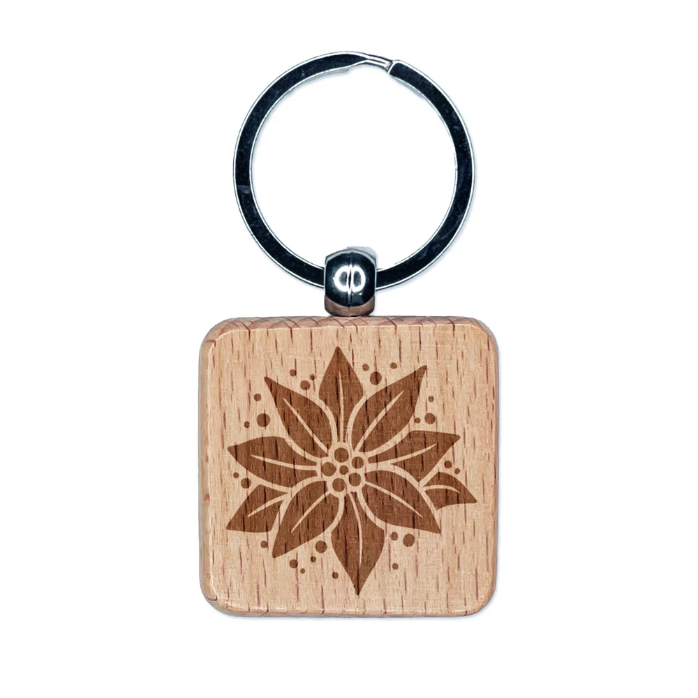 Poinsettia Flower Christmas Engraved Wood Square Keychain Tag Charm