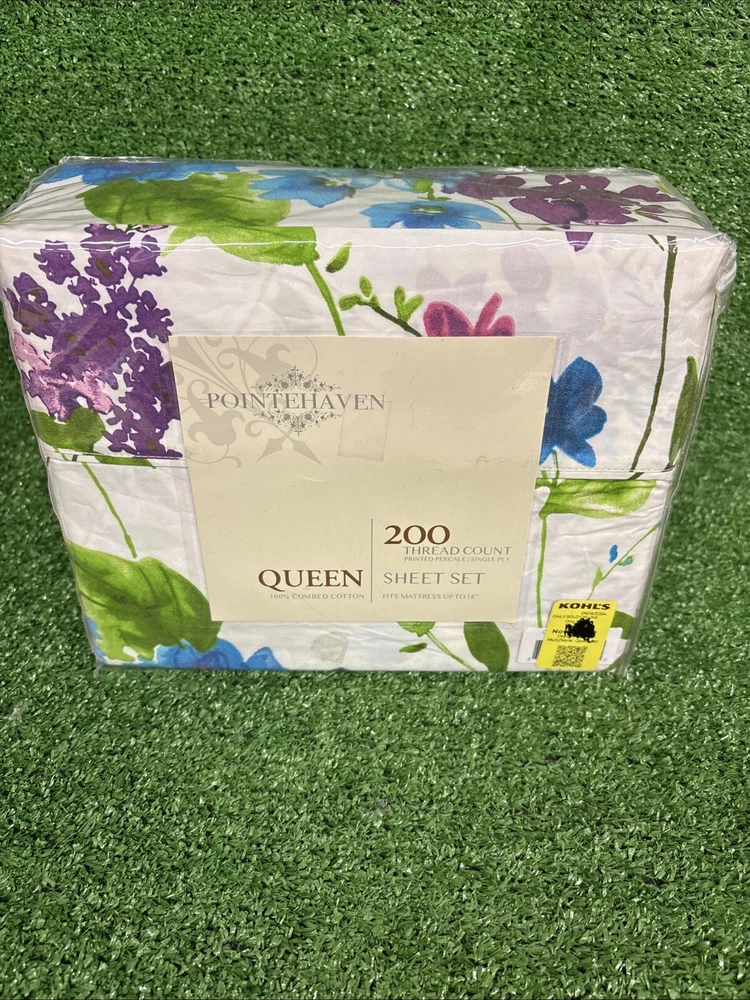 Pointehaven presents a casual style 4-piece Queen Sheet Set with a 200 thread count. The set includes a Queen size flat sheet, fitted sheet, and two standard pillowcases. Made with non-applicable material in a multicolor design, this set is ideal for the bedroom. The Item Width is for a Twin size bed. Listed by-kh Date-1/21/25 Shade/size-blue/purple/white queen Condition-nwt SKU-d69