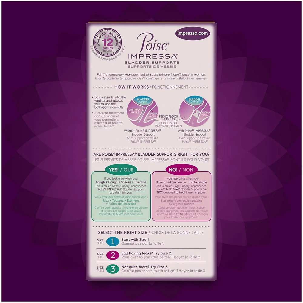 Poise Impressa Bladder Supports Sizing Kit, 1 Each of Size 1, 2, 3 Total 3 Count Poise Impressa Bladder Supports Sizing Kit, Includes 1 Each of Size 1, 2, and 3 Total 3 Count (Packaging May Vary): As a woman always on the go, you need a revolutionary incontinence product that keeps up with your active lifestyle. Poise Impressa Bladder Supports are a comfortable alternative to incontinence pads for women that protects you from bladder leaks before they happen. If you experience overactive bladder when you laugh, cough, sneeze, run or swim — known as Stress Urinary Incontinence (SUI) – Impressa Bladder Supports are for you! Insert Impressa easily into the vagina, like a tampon, to gently lift and support the urethra and to stop bladder leakage while allowing you to use the bathroom as usual. Whether you are running on the treadmill, running errands or running after kids, Impressa provides a comfortable, disposable incontinence solution that eliminates the need for bulky bladder control pads. Poise Impressa can be worn for up to 12 hours within a 24-hour period.Don't know where to start? Try the Poise Impressa Sizing Kit which includes all three sizes, one of each size. Impressa always ships in a discreet box. Help Stop Bladder Leaks Before They Happen : This non-absorbent bladder support works by inserting easily into the vagina and supporting the urethra. Live Your Active Life : Don’t let bladder leaks slow you down! Nine in ten women said their bladder leakage was reduced or stopped after using Impressa Bladder Supports. Find The Right Support For You : With the Poise Impressa Sizing Kit, discover the incontinence protection that’s right for you with 3 sizes to test. Safety Information : Insert Impressa easily into the vagina, like a tampon, to gently lift and support the urethra. Impressa can be worn for up to 12 hours within a 24-hour period. Dispose of Impressa after use. Do not use Impressa for longer than recommended to avoid potential health issues. If you experience discomfort or irritation, discontinue use and consult a healthcare professional. Always wash hands before and after use to maintain hygiene. Directions : Insert Impressa easily into the vagina, like a tampon, to gently lift and support the urethra. Impressa can be worn for up to 12 hours within a 24-hour period. Dispose of Impressa after use.