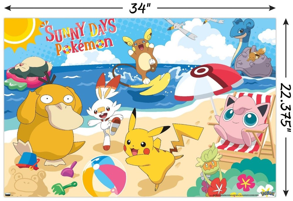 Pokémon - Beach Party Wall Poster, 34L" x 22.4W", Unframed Version Product Details Product Dimensions: 34 x 22.4 x 0.2 inches Item Weight: 2.08 ounces Manufacturer: Trends International Finish types: Glossy Number of pieces: 1 Batteries required: No This Trends Pokemon - Beach Party Wall Poster uses high-resolution artwork and is printed on PhotoArt Gloss Poster Paper which enhances colors with a high-quality look and feel HIGH QUALITY ART PRINT is ready-to-frame or can be hung on the wall using poster mounts, clips, push pins, or thumb tacks OFFICIALLY LICENSED wall poster PERFECT SIZE for any room; poster is 22.375" x 34" EASILY DECORATE any space to create the perfect decor for a party, bedroom, bathroom, kids room, living room, office, dorm, and more Trends International wall posters are everyone's favorite room decor! This Pokémon - Beach Party Wall Poster is created with high-resolution artwork and is printed on glossy poster paper which enhances the colors to make a bold wall decor statement in any room. Decorate the bedroom, bathroom, kid's room, living room, office, dorm, and more! Our art prints are lightweight and easy to hang using the included adhesive poster mounts that won't leave holes in your poster or damage your wall like nails, thumb tacks, or push pins. Every one of our premium posters are proudly Made in the USA. Add these decorations alongside the other accessories on your party supplies list too! Trends International's wall posters are the perfect way to dress up your parties. Poster bundles make great gifts as well! Whether it's for a birthday, Christmas, house warming or for your best friend, they'll love receiving a poster and mount bundle to show off their style.