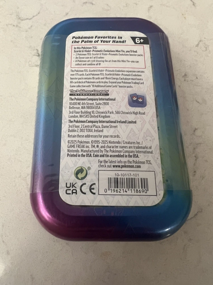 The Pokémon Prismatic Evolutions Mini Tin features a Vaporeon character card from the Evolutions set of the Pokémon Trading Card Game. Manufactured by Nintendo in the United States in 2025, this pack includes a standard-sized card made of card stock and metal material. The mini tin is factory sealed and contains booster packs for collectors to enjoy the English-language cards illustrated by The Pokémon Company Art-team. Recommended for ages 6 and up, this item is a sought-after addition to any Pokémon TCG collection.