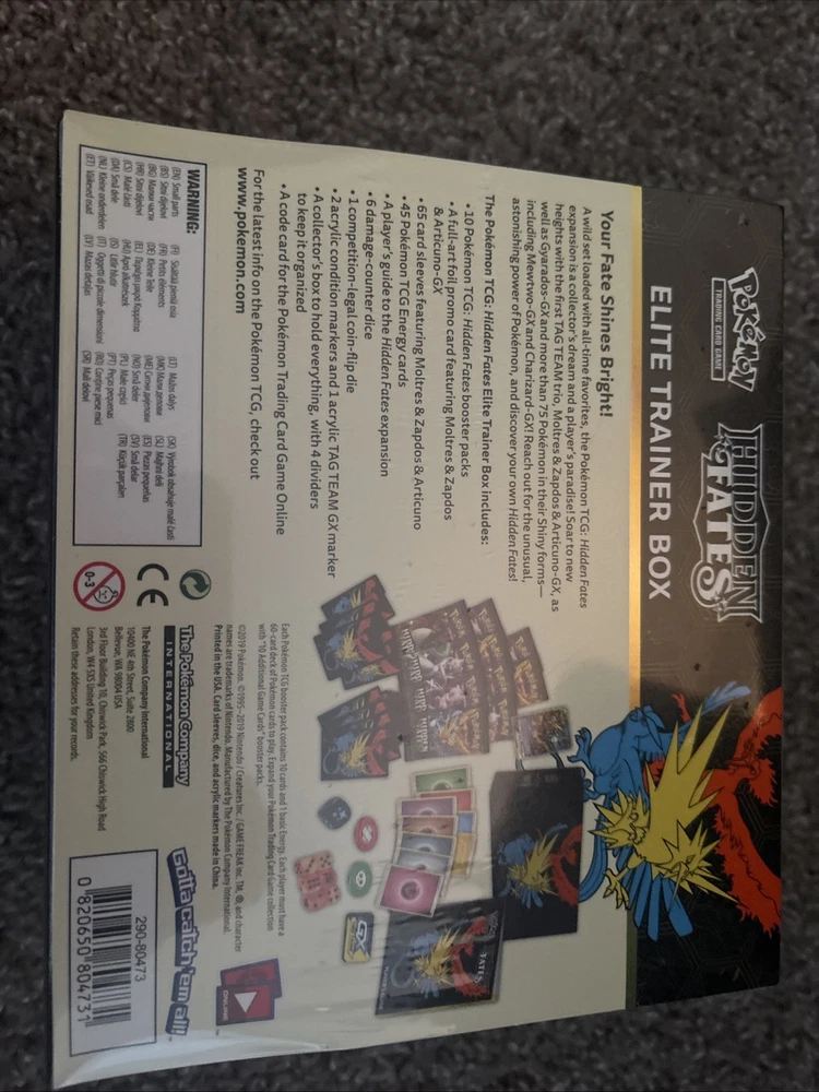 The product is a Pokémon TCG Hidden Fates Trainer Box from 2019, manufactured by Pokémon. It includes 10+ booster packs and 10+ cards, featuring characters such as Zapdos, Articuno, Raichu, Moltres, Charizard, and Gyarados. The cards are made of card stock and come in standard size. The box is a special edition from the Comic Market Japan (Comiket) and includes prize cards, full art cards, and altered art cards. It is suitable for ages 4 and up and the cards are in English language.