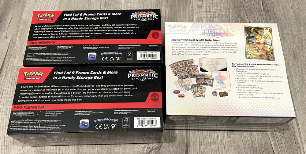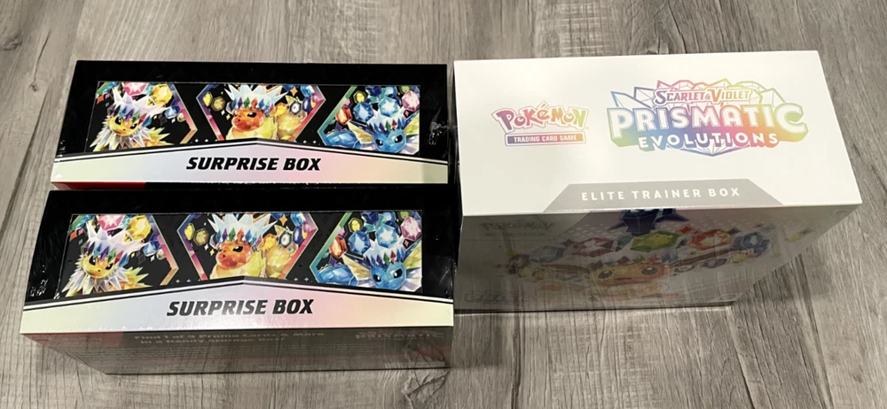 Selling a bundle of Pokémon TCG Prismatic Evolutions products. These items are brand new and factory sealed. You will receive the exact items shown in the photos. You will get: 1 x Prismatic Evolutions Elite Trainer Box (ETB) (this is a normal ETB) 2 x Prismatic Evolutions Surprise Boxes Free shipping via USPS.