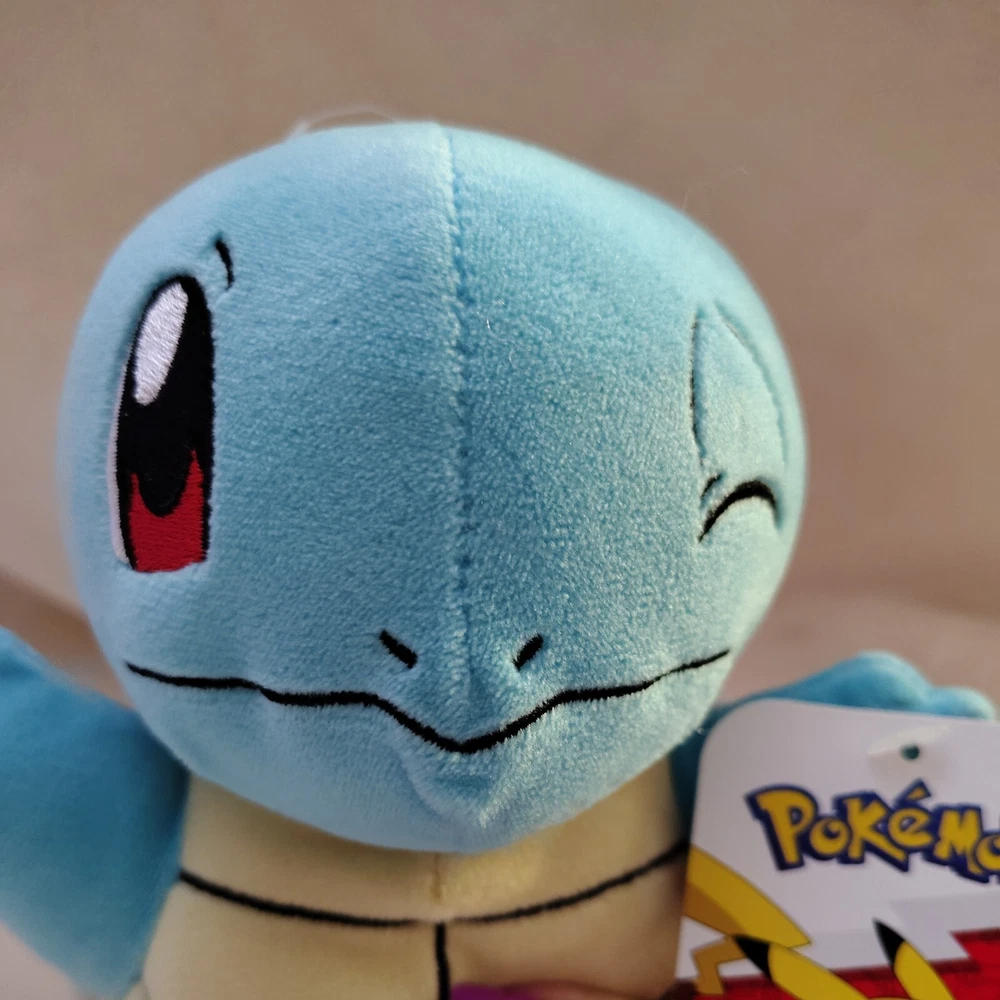 This is an 8" Pokemon Squirtle plush stuffed animal from 2022. The winking turtle is super soft, blue in color, and features embroidered details. It comes with tags and is recommended for ages 2 and up. Manufactured by Jazwares in China, this small-sized toy is part of the Pokemon character family.