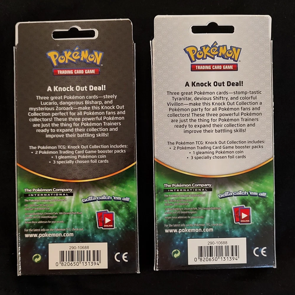 Two SEALED Pokemon XY Era Knock Out Collection boxes (one Tyranitar promo box & one Lucario promo box) from the Pokemon Trading Card Game. These particular boxes are from the 2017 print run and contain XY packs -- NOT the 2022 reprints which contain more recent sets (make sure you understand what you're buying when looking at other listings; most sellers have the later print run or aren't aware there are multiple variations of these). There are two booster packs inside each box: 1x Ancient Origins pack 1x pack of either Roaring Skies or Primal Clash 2 boxes = 4 packs total Print Run Info : I acquired both of these boxes long before the 2022 reprint. I have opened others from the same case to verify the print run/pack selection. For peace of mind in case you wanted to keep these sealed: I've heard from many other collectors that the 2022 print run of these boxes had the coin loosely thrown in the box (meaning it rattles around inside). Whereas the boxes I'm selling (circa 2017) don't rattle; the coin is intact. If you have any further questions or want more pictures, please let me know. I also have more of these if you would like to buy in a different quantity.
