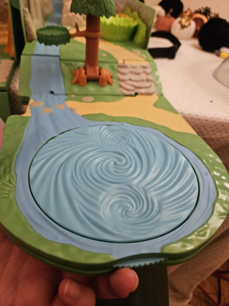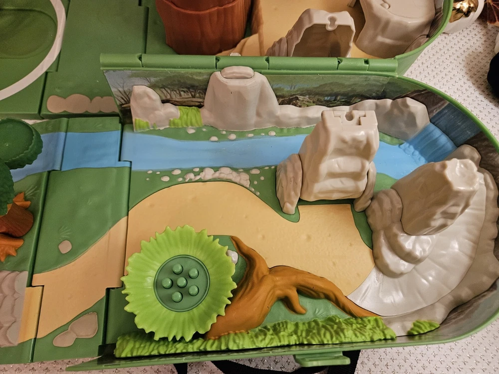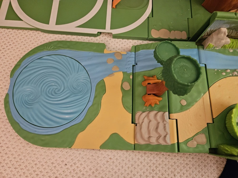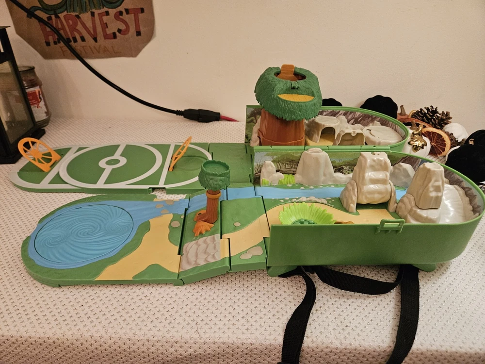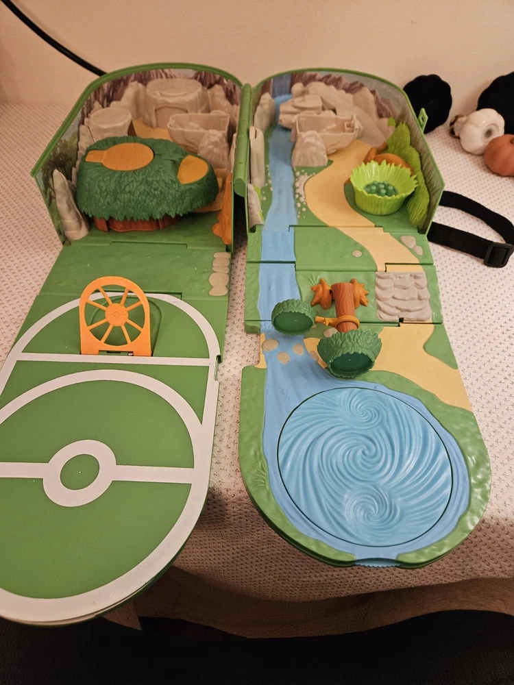 Get ready to catch 'em all with this Pokemon backpack playset! Perfect for any young fan of the popular TV show, this green plastic backpack features the iconic Pokemon franchise and is sure to become a favorite accessory. The playset includes a variety of moving parts and expands into a much larger play area. This set is in good play condition - a few wear marks on the outside, and it appears to be missing a bridge piece to connect the sides. All the moving pieces seem to be intact, would be great for a gift for a child with pokemon figurines, or for an adult for a walk down memory lane.