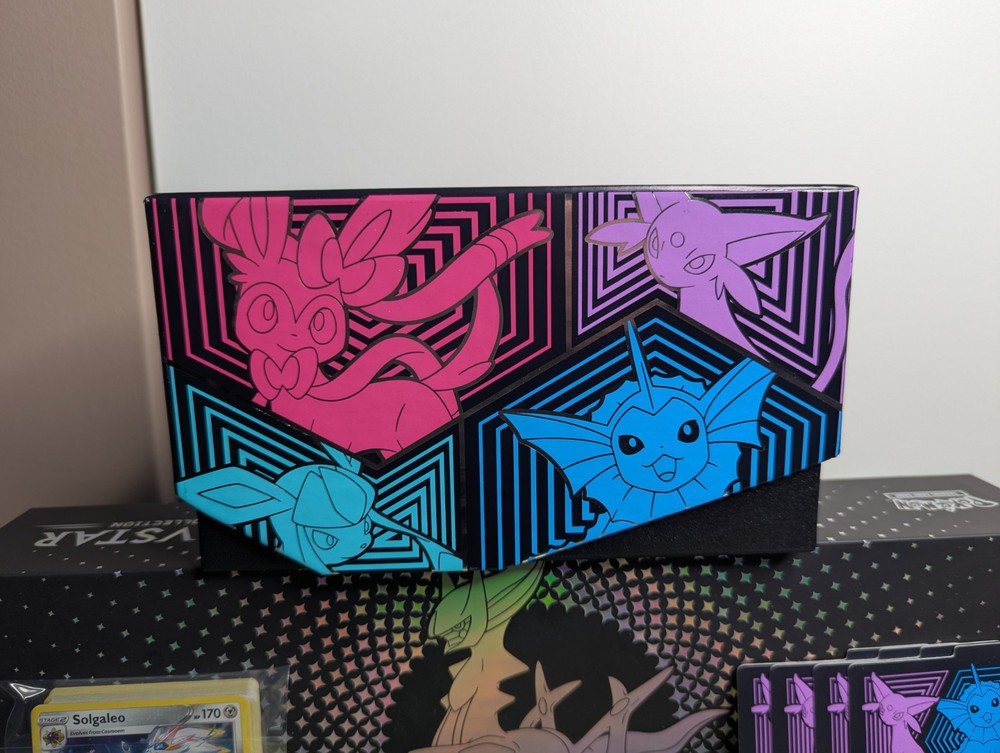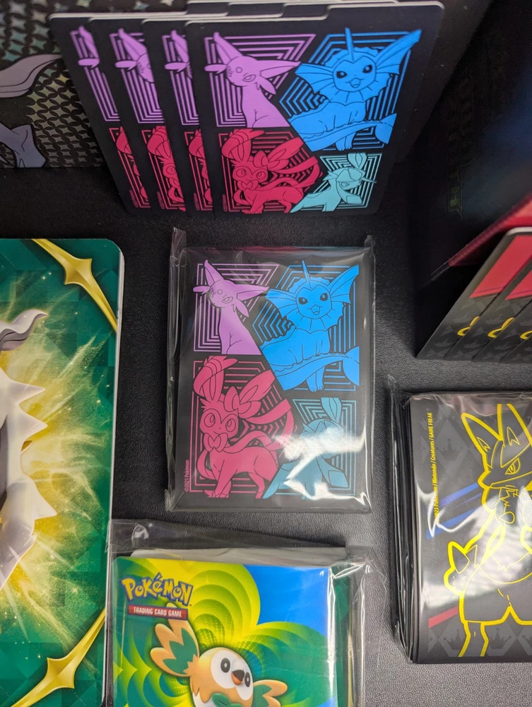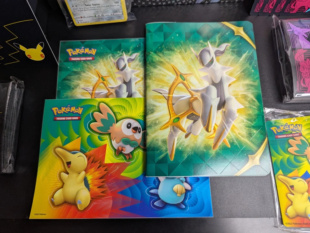 Pokemon Lot of 3 Empty ETB w/ Matching Dividers/Sleeves + Arceus UPC Box + More You will receive everything shown in the first photo. See below: - A total 3 EMPTY Elite Trainer Boxes. - ALL matching dividers (4 per box) and matching sleeves. (Every ETB comes with a matching set of sleeves and dividers.) - (NOT PICTURED) 3 Matching Player's Guide Booklets - EMPTY Arceus UPC box - 2 Sticker Sheets - 1 Arceus Themed Notebook - 1 Mini Portfolio - CELEBRATIONS Holo Bulk ---------------------------------------------------------- Items are in good condition but be sure to review the provided photos for more condition details. ---------------------------------------------------------- This product is a lot of 4 EMPTY ETB boxes from the Pokémon Trading Card Game. The boxes come with matching dividers and sleeves, and come with bonus stickers and other things. You will also get the EMPTY Arceus UPC box. This set is ideal for Pokémon TCG collectors who need storage solutions for their cards, as well as new collectors of all ages! Thanks for looking!