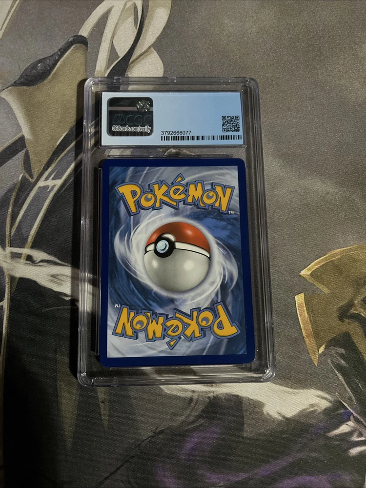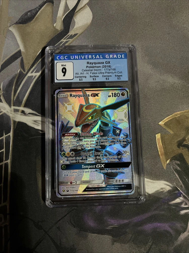 This is a rare and coveted Pokémon TCG card featuring Rayquaza GX from the Hidden Fates set. It is a Black Star Promo card with a full art finish and a holographic appearance. The card is a Basic stage Pokémon with dragon-like attributes and was manufactured in 2019 by The Pokémon Company. The card is in English and has a CGC grade of 9. The illustrator, 5ban Graphics, also contributed to the card's design.