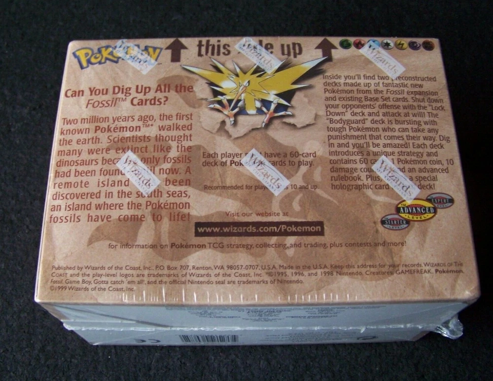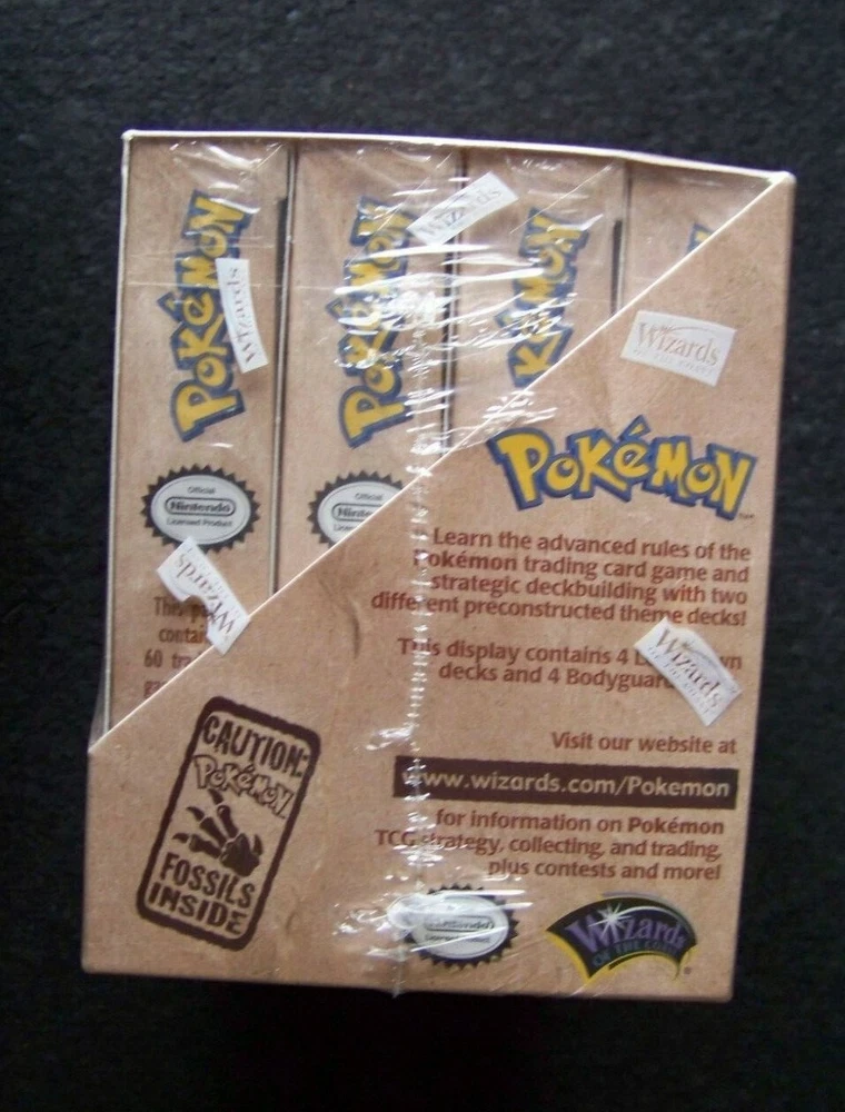 Pokemon Fossil 8 Pre Constructed THEME DECK Bodyguard & Lockdown mini case Display WOTC This listing is for eight original factory sealed 1999 Pokemon Fossil preconstructed theme decks in a sealed display box, 4 - Body Guard and 4 - Lock Down decks. Unopened and factory sealed with original Wizards shrinkwrap. "Each deck introduces a unique strategy and contains 60 cards,1 Pokemon coin, 10 damage counters, an advanced rulebook, plus there's a special holographic card in each deck." SECURE SHIPPING This display box will be double-boxed to protect it during transport, not including the original box you are buying. Shipping will be via USPS Registered Priority Mail, Insured Fully , and the extra precautions of Signature Confirmation , Restricted Delivery. SHIPPING TO U.S.A. ONLY. Note - Only one specific person can sign for it and must have appropriate government ID. If upon receipt, the package appears significantly damaged do not accept it and, return it unopened and unaccepted. Inconvenient, maybe, but these are much safer precautions given that USPS, Fedex, and UPS have been instituting policies that are not always secure. PLEASE ASK IF YOU HAVE ANY QUESTIONS. Don’t forget to click on my "Stores" link, next to my eBay name, to see other items I currently have listed for sale, or you can copy and paste this address into your browser: stores.ebay.com/highcountrycollectibles HIGH COUNTRY COLLECTIBLES Since 1989 – A LEADER IN THE DENVER SPORTS MEMORABILIA MARKET. Check out my other auctions and listings, and keep an eye out for the different, unusual, and EXCLUSIVE items available nowhere else but from High Country Collectibles.