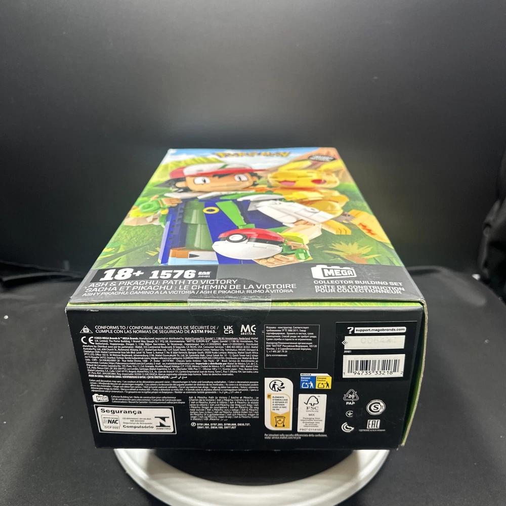 This Pokémon MEGA Collector Building Set features 1576 pieces to create Ash and Pikachu figures. Released in 2023, the plastic blocks come in a box with the theme "Ash & Pikachu: Path to Victory." Suitable for ages 18 and up, the set is part of the Mega Block Collector Building series, showcasing the Pokémon character family. Made by MEGA, this officially licensed product is designed for fans of the Pokémon franchise.