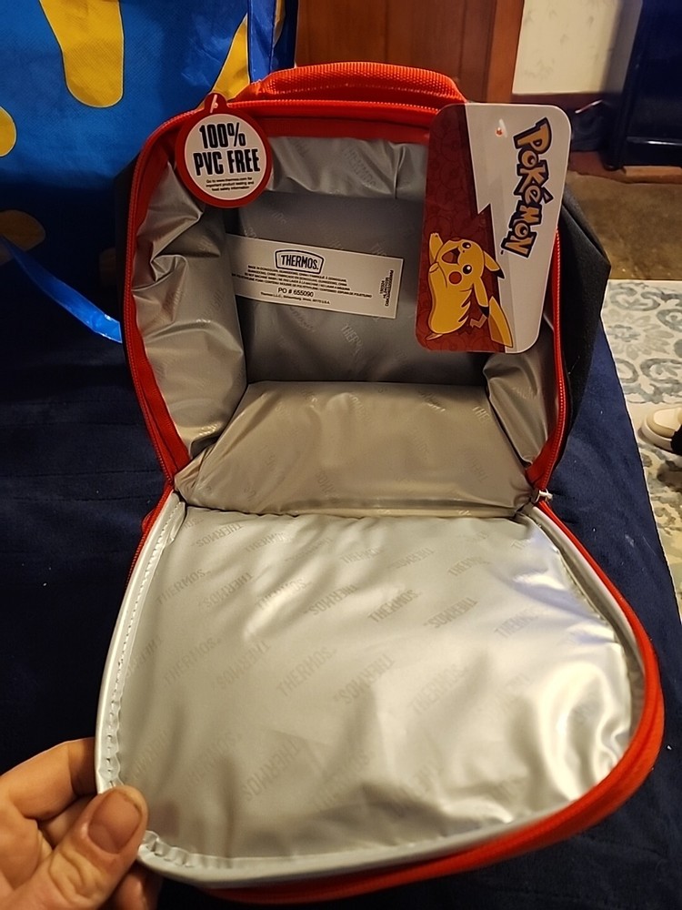 The product is a brand new Pokemon Pikachu Thermos dual compartment lunch bag featuring Pikachu from the Pokémon character family. It has a rectangular shape with a lid that includes a handle for easy carrying. The lunch bag is multicolored and measures 11 inches in height and 8 inches in width. Perfect for fans of Pokémon, this lunch bag is a fun and practical way to carry your meals on the go.