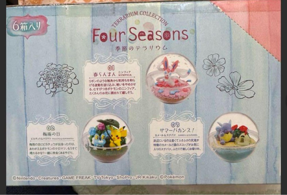 Pokemon Seasonal Terrarium Nymphia Figure - 4 Seasons Box Collectible New Key Features **Product Description:** - Brand: Pokémon - Product Type: Terrarium Collection - Model: Four Seasons BOX - Includes: 6 figures representing each season **Detailed Features:** - Spring: Nymphia - Rainy Day: Pikachu, Keromatsu - Summer Vacation: Kameil, Sunabaa - Autumn Night: Lucario - Leaf Carpet: Rokkon - Snowy Decoration: Yukimenoko - Complete box designed for collectors **Condition of the Item:** - New, sealed with tape to prevent figures from popping out Item Specifics: - Brand: Pokémon - Product Type: Terrarium Collection - Model: Four Seasons BOX - Number of Items: 6 - Condition: New Specifications Brand No Brand Country Japan Franchise Pokemon TV Show Pokemon Color Multicolor Theme Anime,Manga Language Japanese Product Description Item Title Pokemon Seasonal Terrarium Collection Nymphia Figure Payment Supports managed payments Please pay within 5 days after auction is finished. About Us We are located in Japan. It's our pleasure to make you happy by proposing our recommend item. If you have any questions or request about items, please feel free to ask us. International Buyers - Please Note: -Import duties, taxes, and charges are not included in the item price or shipping charges. These charges are the buyer's responsibility. -Please check with your country's customs office to determine what these additional costs will be prior to bidding/buying. -These charges are normally collected by the delivering freight (shipping) company or when you pick the item up - do not confuse them for additional shipping charges. -We do not mark merchandise values below value or mark items as - gifts - The US and International government regulations prohibit such behavior. Thank you for your understanding.
