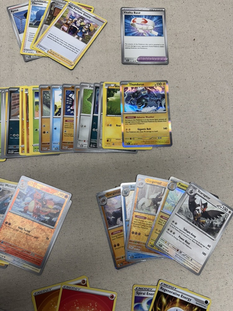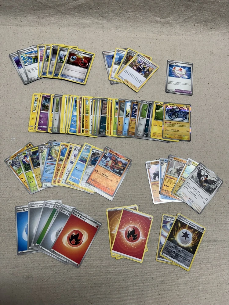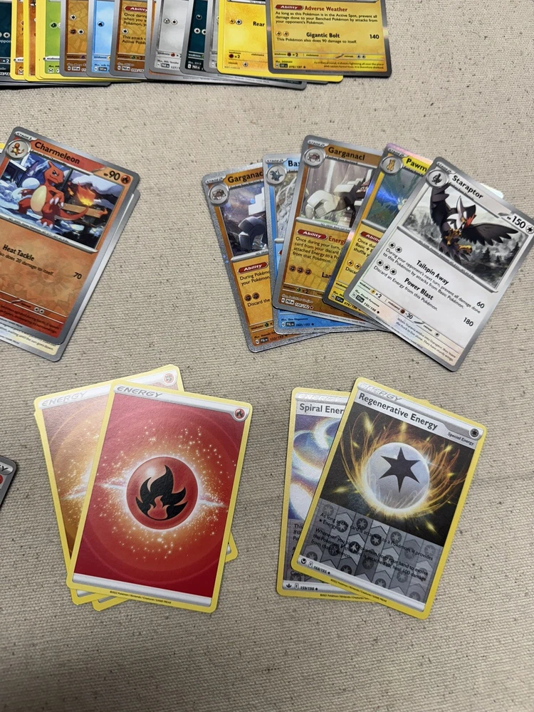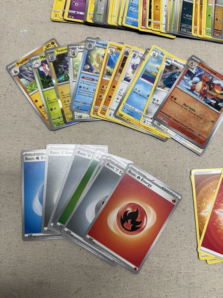 This product is an assortment of Pokémon trading cards that includes various types of cards from random collections, along with 3 coins. The cards are printed in English and manufactured by Nintendo, specifically for the Pokémon Trading Card Game. This collection would be a great addition for fans of the Pokémon TCG looking to expand their card collection with a variety of cards and some collectible coins to enhance their gameplay experience. Here's the breakdown of the types of cards: 30 Basic characters 14 Stage 1 characters 5 stage 2 characters 7 Basic energy 3 Regular energy 2 Special energy 9 Trainer/Item 4 Trainer/Supporter 1 Trainer/Pokemon tool