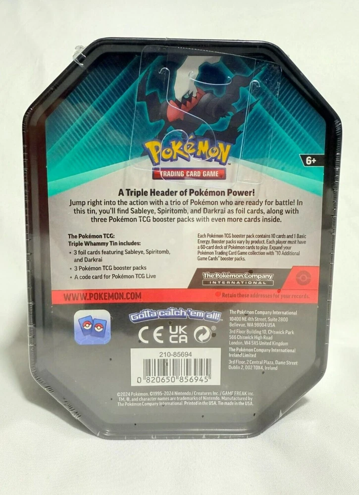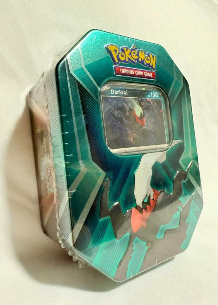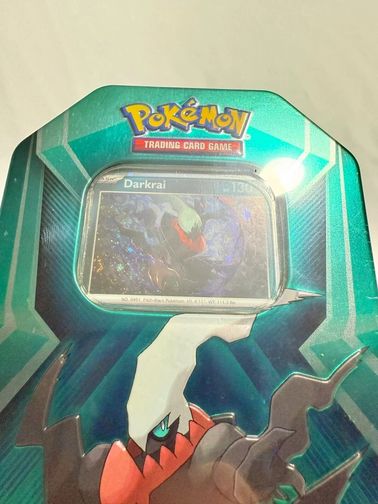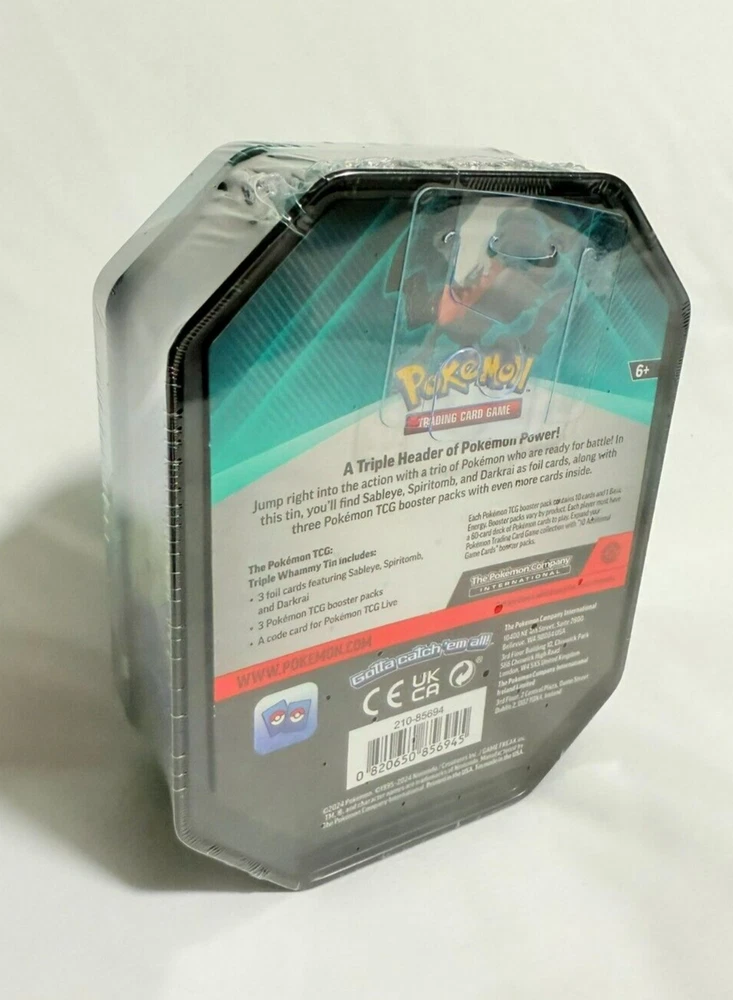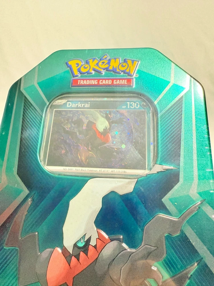 Brand new/factory sealed Triple Whammy Darkrai Tin. Tin contains 3 foil cards featuring Sableye, Spiritomb and Darkrai and 3 booster packs. *Shipping will be USPS Ground Advantage and will ship same day if ordered by 2pm PST on a business day. Feel free to reach out with any questions!