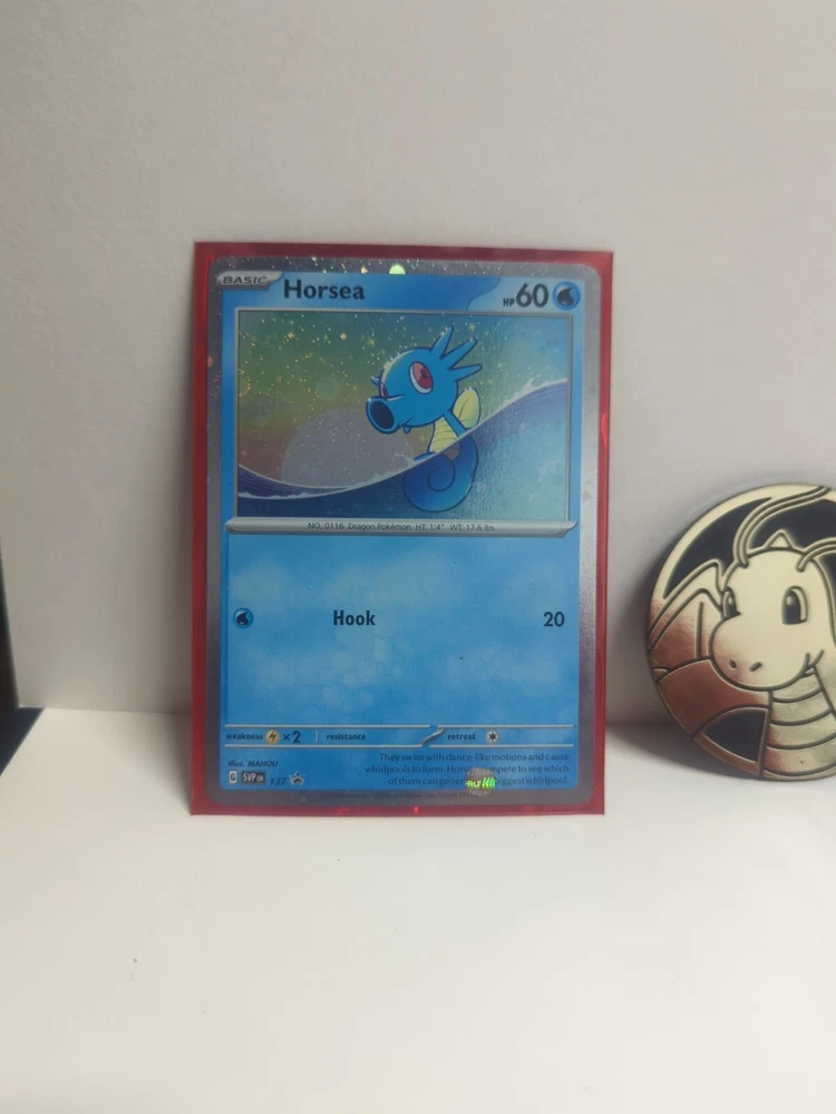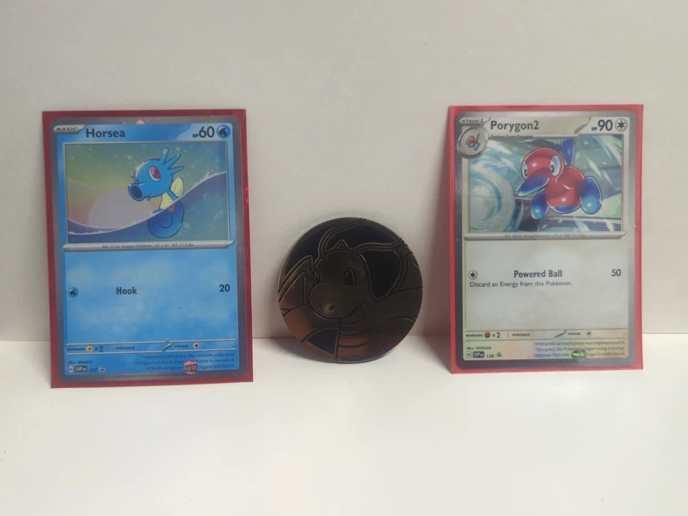 This listing features two rare and highly sought-after Pokémon trading cards, Horsea SVP137 and Porygon2 SVP138, both in standard size and made of high-quality card stock material. These cards are from the Cosmos Holo set and are perfect for collectors of all ages, with an age level recommendation of 6+. In addition to these two cards, this listing also includes a Dragonite coin, adding even more value to your collection. These cards are non-sport trading cards and were manufactured by Pokemon in the United States. Don't miss your chance to own these amazing cards from the Pokémon franchise and TV show.