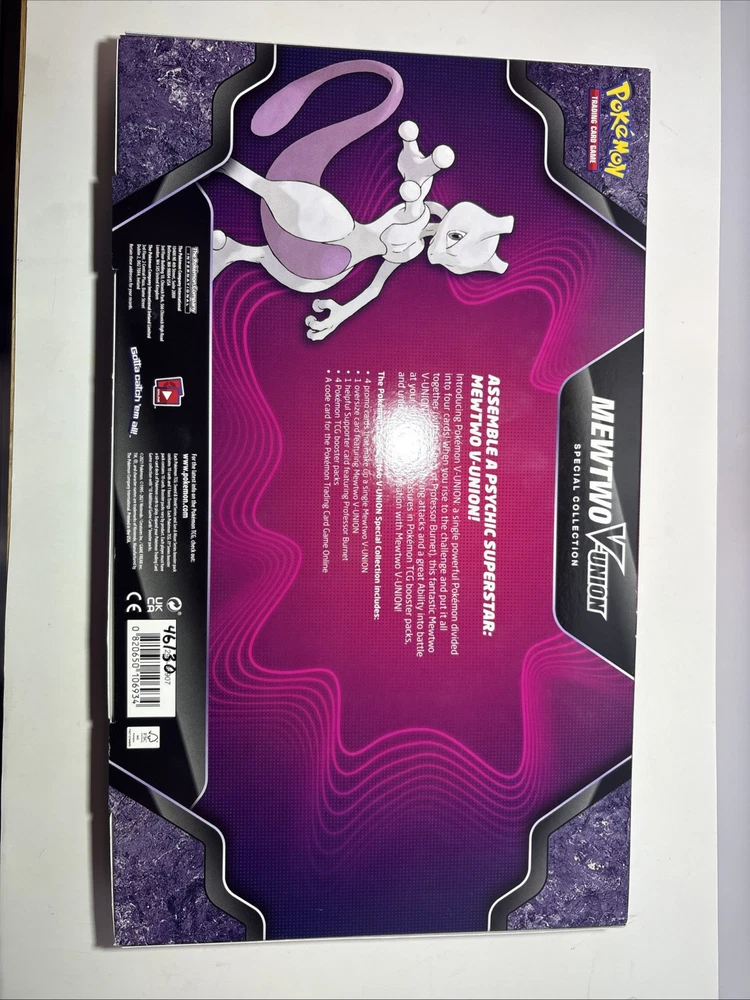 The product is a brand new and sealed Pokémon TCG Mewtwo V Union Special Collection Box. It contains 45 cards, including a Mewtwo V Union card, and is manufactured by Nintendo. The box features booster packs and is designed for the Arena League event. The cards are made of high-quality card stock and are in English language. The box is configured with 1 box and is suitable for ages 6 and up. The illustrations are done by 5ban Graphics and the featured person/artist is Aaron Jeffery. The year of manufacture is 2022. Evolving skies pack!