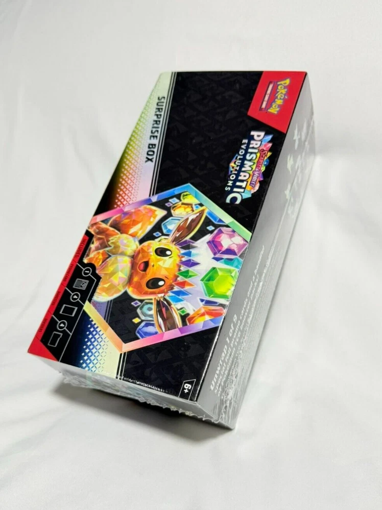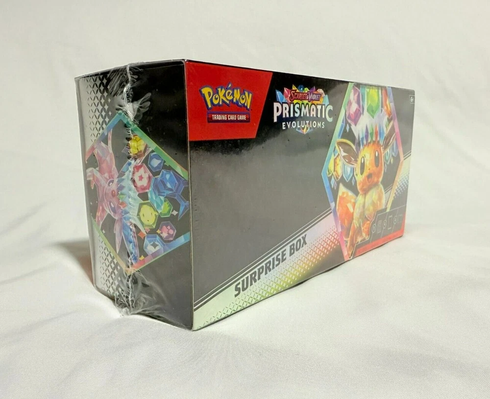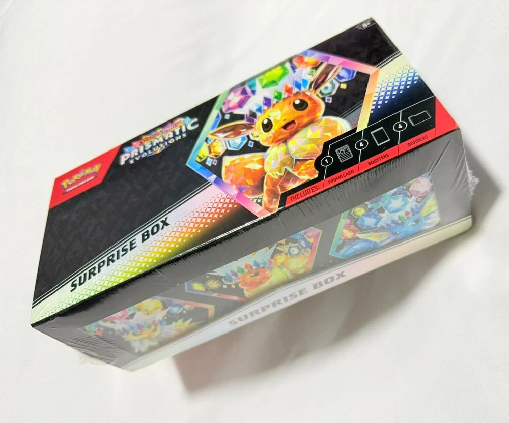1 promo 4 booster packs 4 dividers Brand new/factory sealed Pokemon TCG: Prismatic Evolutions Surprise Box. The box contains 1 random Evee foil card, 4 booster packs and 4 dividers. Box can be used to organize and store your cards. *Shipping will be USPS Ground Advantage and will ship same day if ordered by 2pm PST on a business day. Feel free to reach out with any questions!