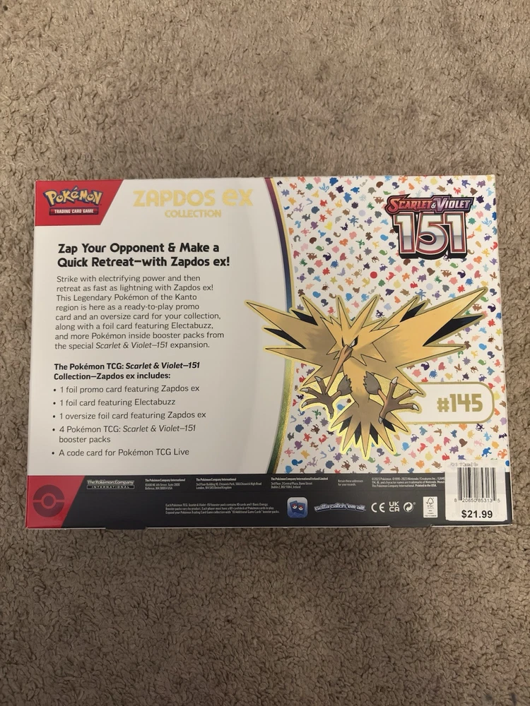 Pokemon TCG: Scarlet & Violet 151 | Zapdos EX Collection Box (SEALED/NEW) Strike with electrifying power and then retreat as fast as lightning with Zapdos ex! This Legendary Pokémon of the Kanto region is here as a ready-to-play promo card and an oversize card for your collection, along with a foil card featuring Electabuzz, and more Pokémon inside booster packs from the special Scarlet & Violet—151 expansion. The Pokémon TCG: Scarlet & Violet—151 Collection—Zapdos ex includes: - 1 foil promo card featuring Zapdos ex - 1 foil card featuring Electabuzz - 1 oversize foil card featuring Zapdos ex - 4 Pokémon TCG: Scarlet & Violet—151 booster packs - A code card for Pokémon TCG Live
